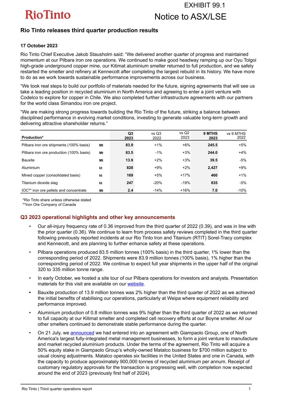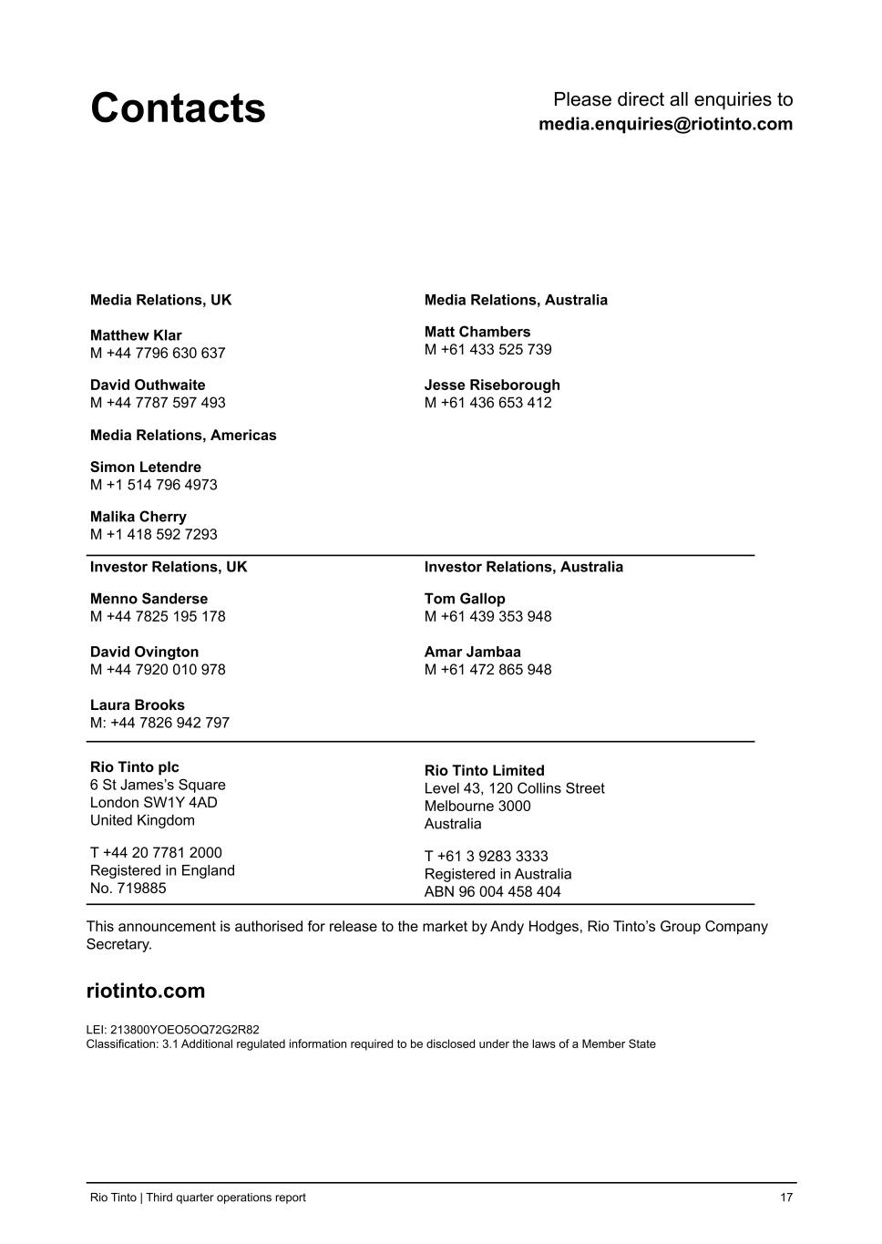 | Rio Tinto plc | Rio Tinto Limited |