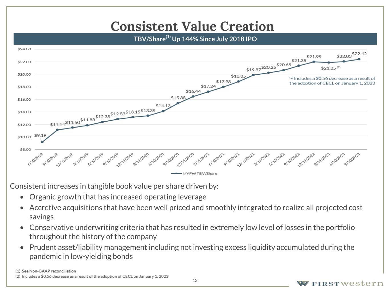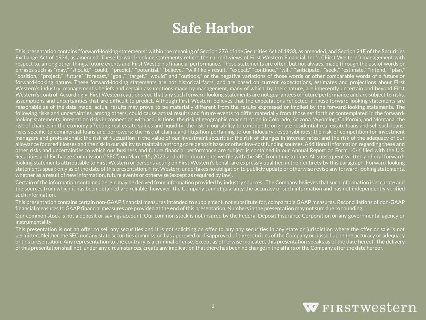 Safe Harbor 2 This presentation contains “forward-looking statements” within the meaning of Section 27A of the Securities Act of 1933, as amended, and Section 21E of the Securities Exchange Act of 1934, as amended. These forward-looking statements reflect the current views of First Western Financial, Inc.’s (“First Western”) management with respect to, among other things, future events and First Western’s financial performance. These statements are often, but not always, made through the use of words or phrases such as “may,” “should,” “could,” “predict,” “potential,” “believe,” “will likely result,” “expect,” “continue,” “will,” “anticipate,” “seek,” “estimate,” “intend,” “plan,” “position,” “project,” “future” “forecast,” “goal,” “target,” “would” and “outlook,” or the negative variations of those words or other comparable words of a future or forward-looking nature. These forward-looking statements are not historical facts, and are based on current expectations, estimates and projections about First Western’s industry, management’s beliefs and certain assumptions made by management, many of which, by their nature, are inherently uncertain and beyond First Western’s control. Accordingly, First Western cautions you that any such forward-looking statements are not guarantees of future performance and are subject to risks, assumptions and uncertainties that are difficult to predict. Although First Western believes that the expectations reflected in these forward-looking statements are reasonable as of the date made, actual results may prove to be materially different from the results expressed or implied by the forward-looking statements. The following risks and uncertainties, among others, could cause actual results and future events to differ materially from those set forth or contemplated in the forward- looking statements: integration risks in connection with acquisitions; the risk of geographic concentration in Colorado, Arizona, Wyoming, California, and Montana; the risk of changes in the economy affecting real estate values and liquidity; the risk in our ability to continue to originate residential real estate loans and sell such loans; risks specific to commercial loans and borrowers; the risk of claims and litigation pertaining to our fiduciary responsibilities; the risk of competition for investment managers and professionals; the risk of fluctuation in the value of our investment securities; the risk of changes in interest rates; and the risk of the adequacy of our allowance for credit losses and the risk in our ability to maintain a strong core deposit base or other low-cost funding sources. Additional information regarding these and other risks and uncertainties to which our business and future financial performance are subject is contained in our Annual Report on Form 10-K filed with the U.S. Securities and Exchange Commission (“SEC”) on March 15, 2023 and other documents we file with the SEC from time to time. All subsequent written and oral forward- looking statements attributable to First Western or persons acting on First Western’s behalf are expressly qualified in their entirety by this paragraph. Forward-looking statements speak only as of the date of this presentation. First Western undertakes no obligation to publicly update or otherwise revise any forward-looking statements, whether as a result of new information, future events or otherwise (except as required by law). Certain of the information contained herein may be derived from information provided by industry sources. The Company believes that such information is accurate and the sources from which it has been obtained are reliable; however, the Company cannot guaranty the accuracy of such information and has not independently verified such information. This presentation contains certain non-GAAP financial measures intended to supplement, not substitute for, comparable GAAP measures. Reconciliations of non-GAAP financial measures to GAAP financial measures are provided at the end of this presentation. Numbers in the presentation may not sum due to rounding. Our common stock is not a deposit or savings account. Our common stock is not insured by the Federal Deposit Insurance Corporation or any governmental agency or instrumentality. This presentation is not an offer to sell any securities and it is not soliciting an offer to buy any securities in any state or jurisdiction where the offer or sale is not permitted. Neither the SEC nor any state securities commission has approved or disapproved of the securities of the Company or passed upon the accuracy or adequacy of this presentation. Any representation to the contrary is a criminal offense. Except as otherwise indicated, this presentation speaks as of the date hereof. The delivery of this presentation shall not, under any circumstances, create any implication that there has been no change in the affairs of the Company after the date hereof.