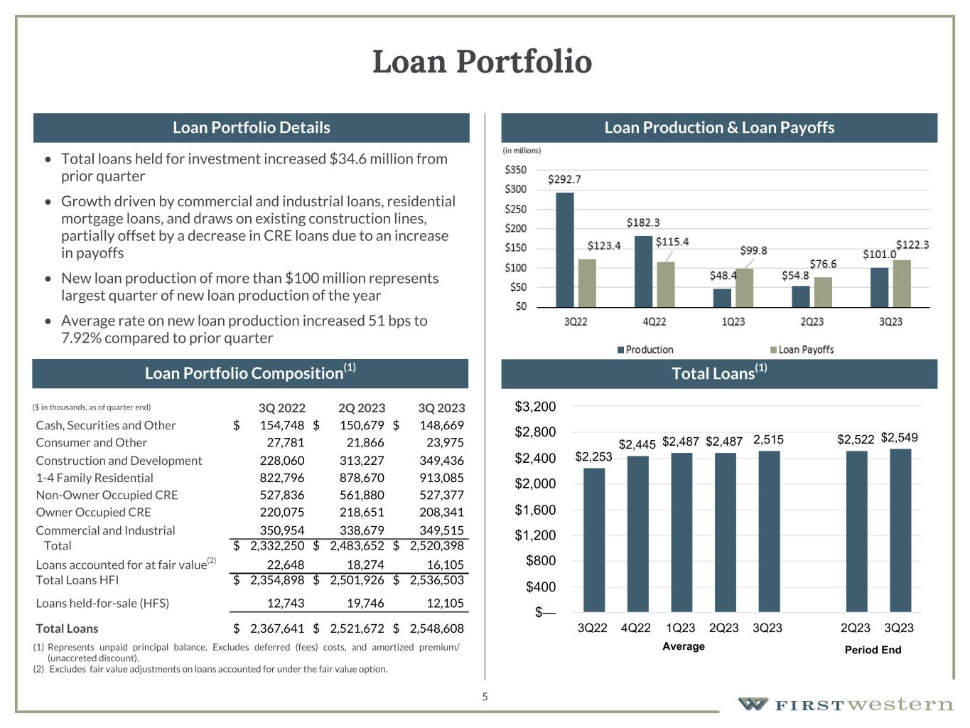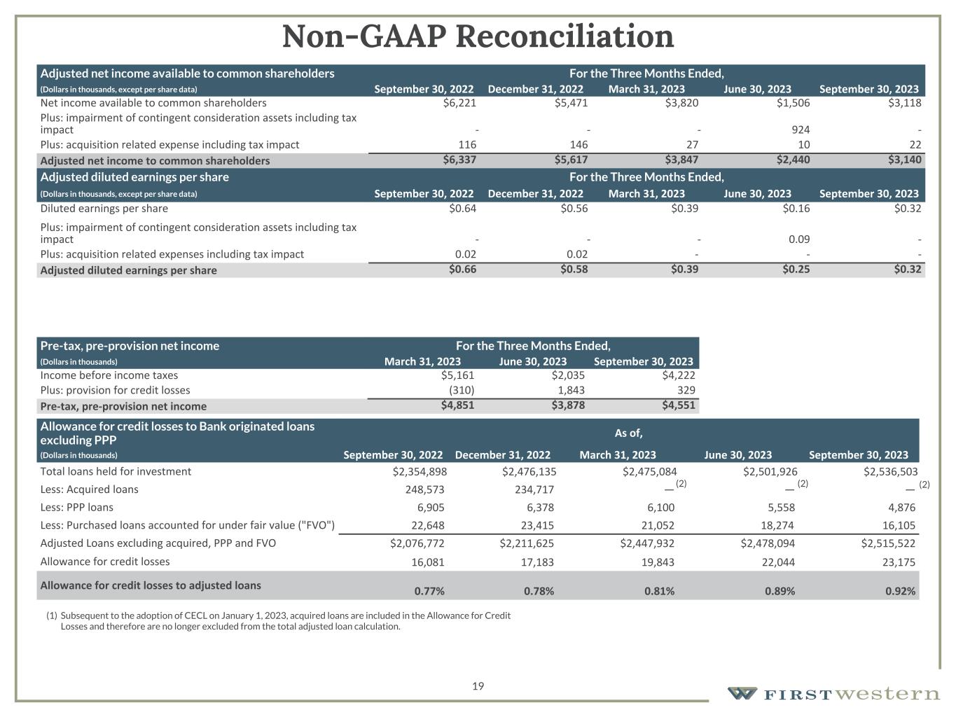 Scott C. Wylie, CEO of First Western, commented, "We delivered another quarter of strong financial performance and generated $4.6 million in pre-tax, pre-provision income, an increase of 17% from the prior quarter, while continuing to operate with a conservative approach, prioritizing prudent risk management, and maintaining high levels of liquidity, capital and reserves. While remaining disciplined in our underwriting and pricing criteria, we had our largest quarter of new loan production so far this year, which reflects the strength of the clients that we work with and the attractive lending opportunities that we are seeing throughout our markets. Importantly, we continue to see good results from our focus on deposit gathering, and our deposit growth outpaced our loan growth during the third quarter.
