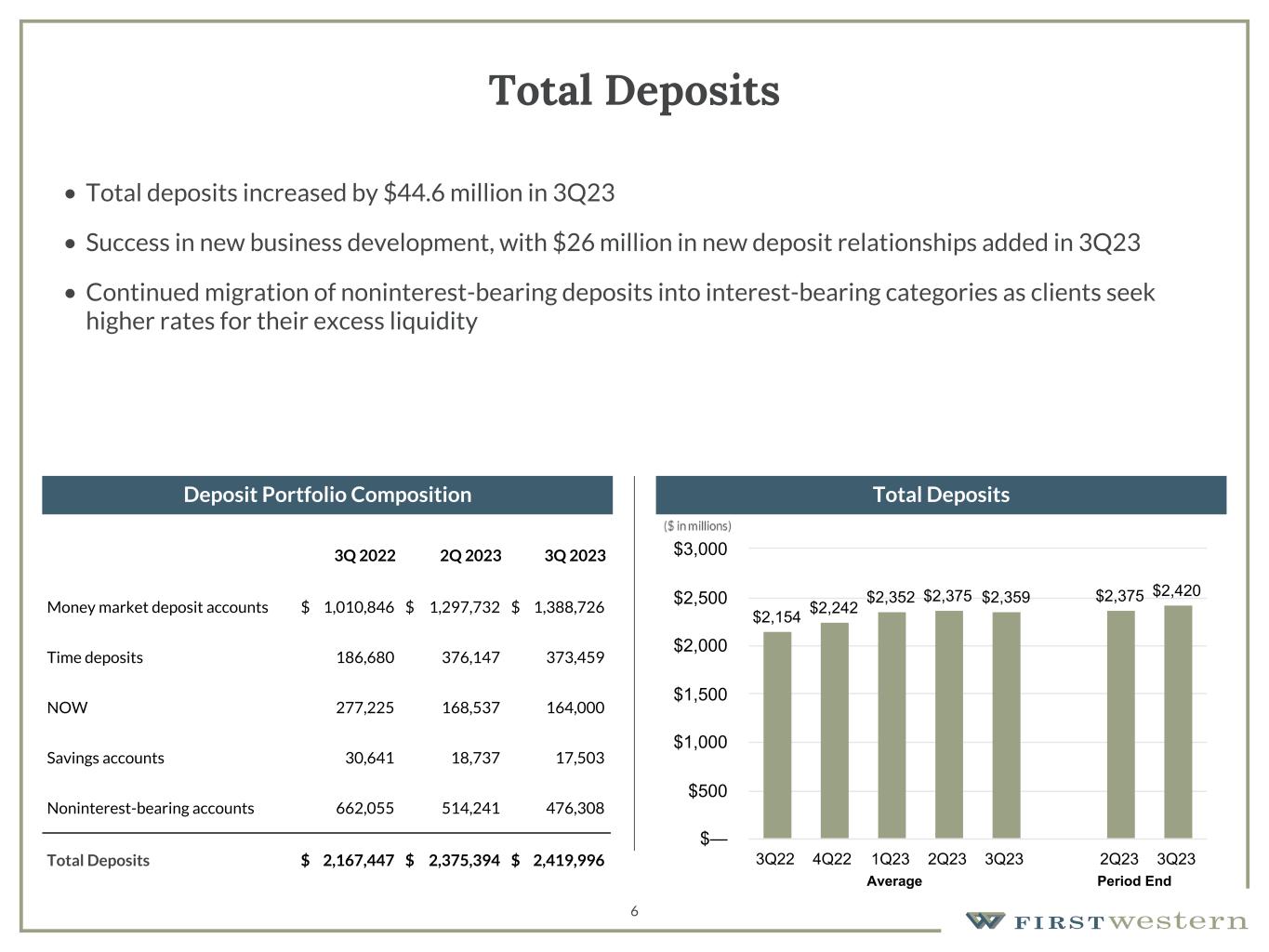 •Total deposits increased to $2.42 billion, or 1.9%, from $2.38 billion as of Q2 2023, and were up 11.7% from $2.17 billion as of Q3 2022