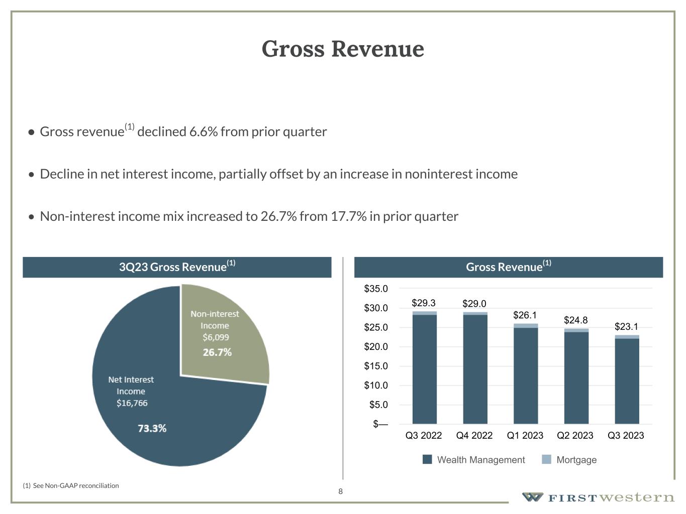 Total income before non-interest expense was $22.5 million for the third quarter of 2023, an increase of 9.6%, compared to $20.6 million for the second quarter of 2023. Gross revenue(1) was $23.1 million for the third quarter of 2023, a decrease of 6.6%, from $24.8 million for the second quarter of 2023. The decrease was primarily driven by a decrease in net interest income as a result of higher interest expense primarily due to higher deposit costs, offset partially by higher interest income. Relative to the third quarter of 2022, Total income before non-interest expense decreased 18.0% from $27.5 million. Relative to the third quarter of 2022, gross revenue decreased 21.0% from $29.3 million. The decrease was driven by a decrease in net interest income as a result of higher interest expense due to higher deposit costs, offset partially by higher interest income.