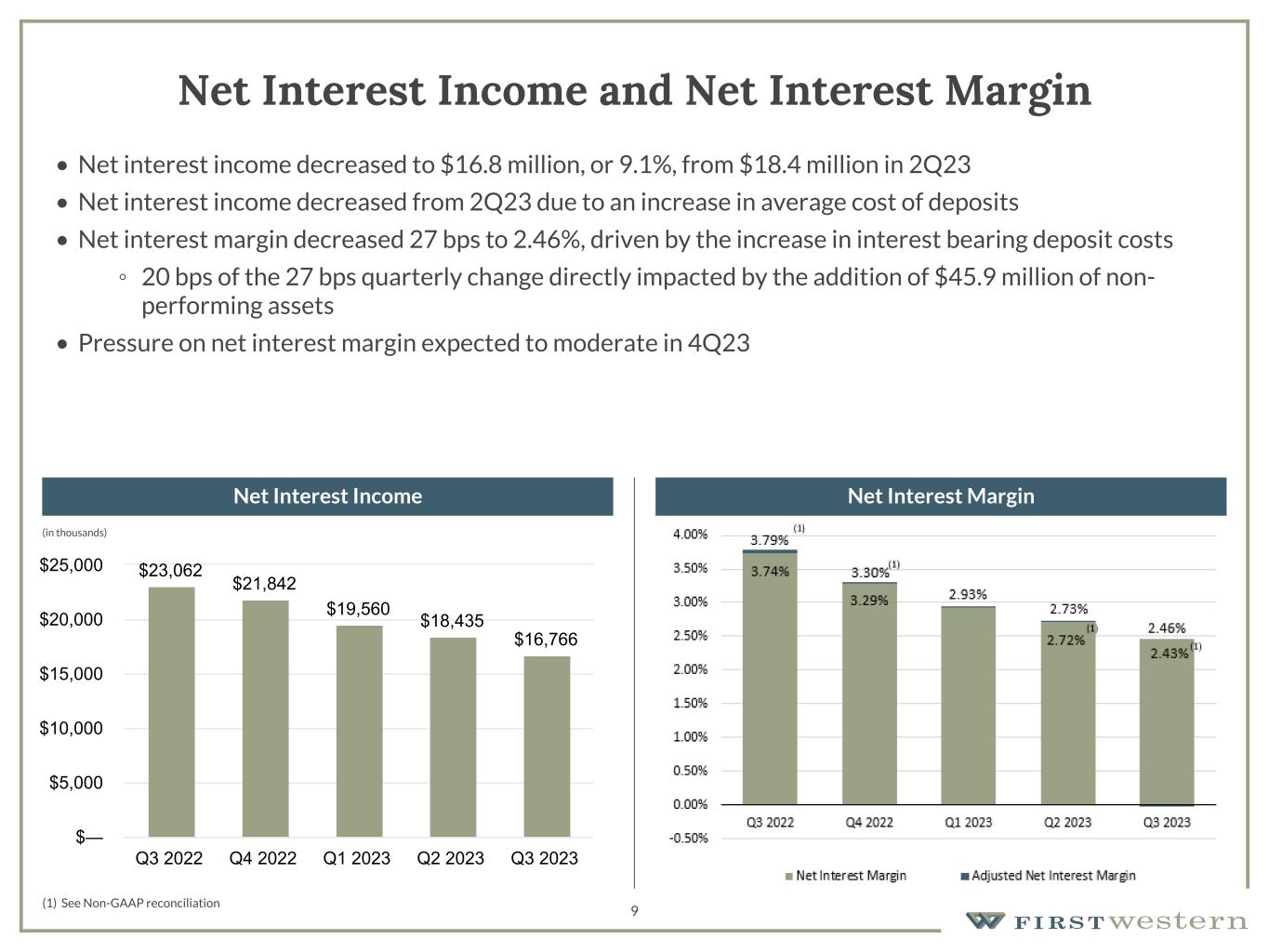 Net interest margin for the third quarter of 2023 decreased 27 basis points to 2.46% from 2.73% reported in the second quarter of 2023. During the third quarter of 2023, net interest margin was negatively impacted by the addition of $45.9 million of non-performing assets, resulting in a 20 basis point decrease. Average cost of deposits increased 26 basis points in the third quarter of 2023 compared to the second quarter of 2023 driven by a rising rate environment and a highly competitive deposit market.