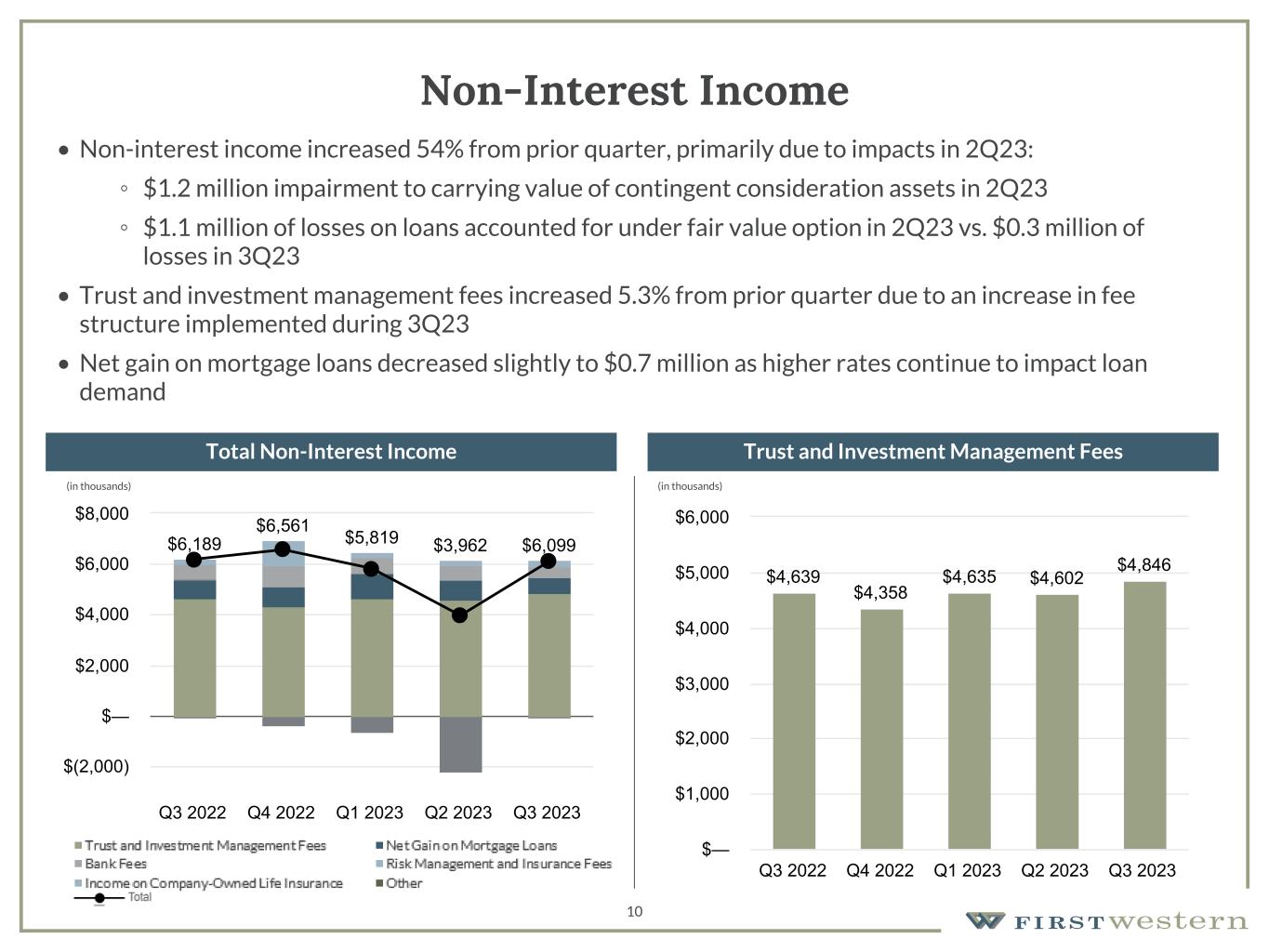Non-interest income for the third quarter of 2023 was $6.1 million, an increase of 53.9%, from $4.0 million in the second quarter of 2023. The increase was partially driven by growth in Trust and advisory fees during the third quarter of 2023, as well as a $1.2 million impairment to the carrying value of contingent consideration assets recorded in the second quarter of 2023, not recurring in the third quarter of 2023. The increase in non-interest income was further driven by losses of $1.1 million recorded on loans accounted for under the fair value option during the second quarter of 2023, compared to $0.3 million of losses recorded during the third quarter of 2023.