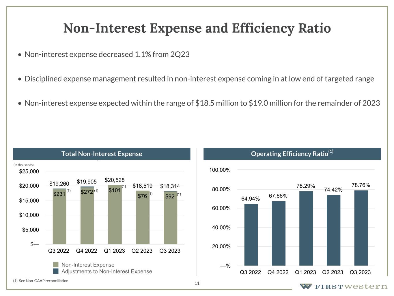 157 180 196 164 166 168 62 94 111 154 161 132 122 125 129 76 78 86 255 255 255 Chart color Table color Special Headlines Slide Headlines / Text on light background Primary Colors Secondary Colors Primary Background / Call Out Boxes / Text on dark background Chart color Table Color Tertiary Colors Chart color Table Color Chart Color Chart Color Approved Fonts AaBbCc 123 Lora (bold) Slide Headlines / Special Headlines AaBbCc 123 Lato (regular, bold, italics) Body Copy / Subheadings / Small Text Descriptions 10 Non-Interest Income • Non-interest income increased 54% from prior quarter, primarily due to impacts in 2Q23: ◦ $1.2 million impairment to carrying value of contingent consideration assets in 2Q23 ◦ $1.1 million of losses on loans accounted for under fair value option in 2Q23 vs. $0.3 million of losses in 3Q23 • Trust and investment management fees increased 5.3% from prior quarter due to an increase in fee structure implemented during 3Q23 • Net gain on mortgage loans decreased slightly to $0.7 million as higher rates continue to impact loan demand (in thousands) Total Non-Interest Income Trust and Investment Management Fees $6,189 $6,561 $5,819 $3,962 $6,099 Q3 2022 Q4 2022 Q1 2023 Q2 2023 Q3 2023 $(2,000) $— $2,000 $4,000 $6,000 $8,000 $4,639 $4,358 $4,635 $4,602 $4,846 Q3 2022 Q4 2022 Q1 2023 Q2 2023 Q3 2023 $— $1,000 $2,000 $3,000 $4,000 $5,000 $6,000 (in thousands)