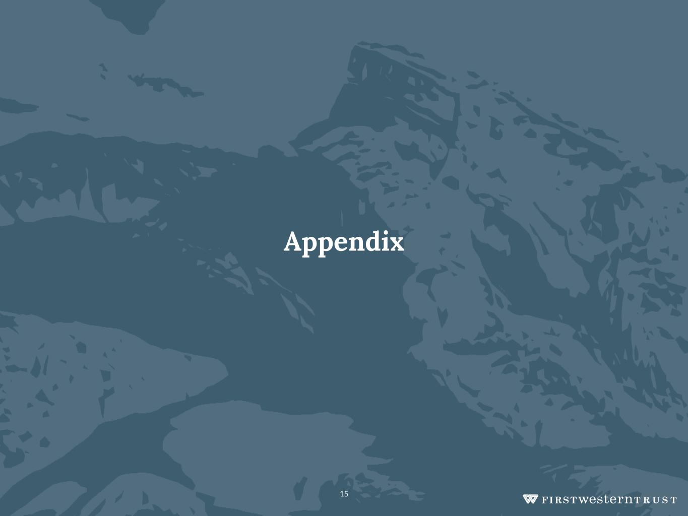 157 180 196 164 166 168 62 94 111 154 161 132 122 125 129 76 78 86 255 255 255 Chart color Table color Special Headlines Slide Headlines / Text on light background Primary Colors Secondary Colors Primary Background / Call Out Boxes / Text on dark background Chart color Table Color Tertiary Colors Chart color Table Color Chart Color Chart Color Approved Fonts AaBbCc 123 Lora (bold) Slide Headlines / Special Headlines AaBbCc 123 Lato(regular, bold, italics) Body Copy / Subheadings / Small Text Descriptions 14 Near-Term Outlook • Prudent risk management will remain top priority while economic uncertainty remains, which will impact level of profitability in short term • Continued focus on executing well on the areas that we can control • Balance sheet management • Attracting new clients with particular focus on core deposit relationships and Trust and Investment Management assets • Providing exceptional service to existing clients • Tightly managing expenses • While maintaining a conservative approach to operating in the current environment, investments continue to be made in areas that will further enhance business development capabilities including first full office in Bozeman market • By balancing near-term conservative approach with continued long-term investments, First Western is well positioned to continue capitalizing on our attractive markets to consistently add new clients, realize more operating leverage as we increase scale, generate profitable growth, and further enhance the value of our franchise