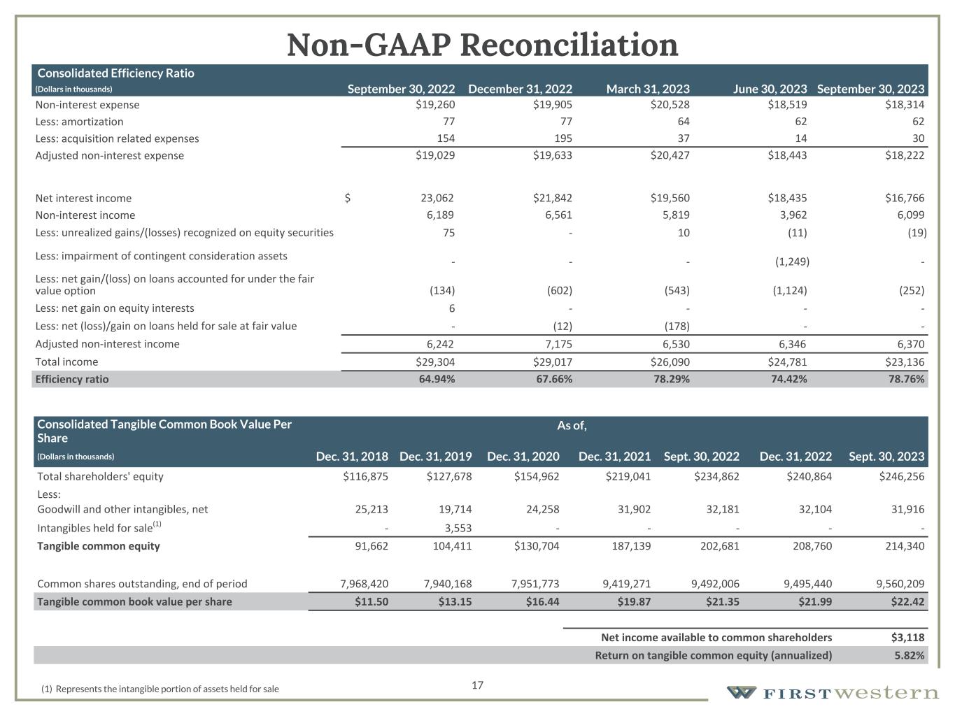 157 180 196 164 166 168 62 94 111 154 161 132 122 125 129 76 78 86 255 255 255 Chart color Table color Special Headlines Slide Headlines / Text on light background Primary Colors Secondary Colors Primary Background / Call Out Boxes / Text on dark background Chart color Table Color Tertiary Colors Chart color Table Color Chart Color Chart Color Approved Fonts AaBbCc 123 Lora (bold) Slide Headlines / Special Headlines AaBbCc 123 Lato (regular, bold, italics) Body Copy / Subheadings / Small Text Descriptions 17 Non-GAAP Reconciliation Consolidated Tangible Common Book Value Per Share As of, (Dollars in thousands) Dec. 31, 2018 Dec. 31, 2019 Dec. 31, 2020 Dec. 31, 2021 Sept. 30, 2022 Dec. 31, 2022 Sept. 30, 2023 Total shareholders' equity $116,875 $127,678 $154,962 $219,041 $234,862 $240,864 $246,256 Less: Goodwill and other intangibles, net 25,213 19,714 24,258 31,902 32,181 32,104 31,916 Intangibles held for sale(1) - 3,553 - - - - - Tangible common equity 91,662 104,411 $130,704 187,139 202,681 208,760 214,340 Common shares outstanding, end of period 7,968,420 7,940,168 7,951,773 9,419,271 9,492,006 9,495,440 9,560,209 Tangible common book value per share $11.50 $13.15 $16.44 $19.87 $21.35 $21.99 $22.42 Net income available to common shareholders $3,118 Return on tangible common equity (annualized) 5.82% (1) Represents the intangible portion of assets held for sale Consolidated Efficiency Ratio (Dollars in thousands) September 30, 2022 December 31, 2022 March 31, 2023 June 30, 2023 September 30, 2023 Non-interest expense $19,260 $19,905 $20,528 $18,519 $18,314 Less: amortization 77 77 64 62 62 Less: acquisition related expenses 154 195 37 14 30 Adjusted non-interest expense $19,029 $19,633 $20,427 $18,443 $18,222 Net interest income $ 23,062 $21,842 $19,560 $18,435 $16,766 Non-interest income 6,189 6,561 5,819 3,962 6,099 Less: unrealized gains/(losses) recognized on equity securities 75 - 10 (11) (19) Less: impairment of contingent consideration assets - - - (1,249) - Less: net gain/(loss) on loans accounted for under the fair value option (134) (602) (543) (1,124) (252) Less: net gain on equity interests 6 - - - - Less: net (loss)/gain on loans held for sale at fair value - (12) (178) - - Adjusted non-interest income 6,242 7,175 6,530 6,346 6,370 Total income $29,304 $29,017 $26,090 $24,781 $23,136 Efficiency ratio 64.94% 67.66% 78.29% 74.42% 78.76%