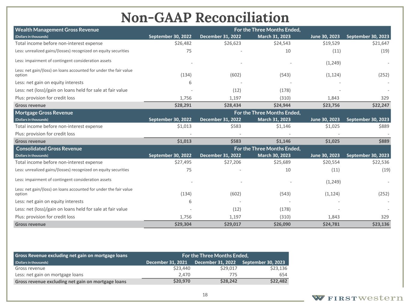 157 180 196 164 166 168 62 94 111 154 161 132 122 125 129 76 78 86 255 255 255 Chart color Table color Special Headlines Slide Headlines / Text on light background Primary Colors Secondary Colors Primary Background / Call Out Boxes / Text on dark background Chart color Table Color Tertiary Colors Chart color Table Color Chart Color Chart Color Approved Fonts AaBbCc 123 Lora (bold) Slide Headlines / Special Headlines AaBbCc 123 Lato (regular, bold, italics) Body Copy / Subheadings / Small Text Descriptions 18 Non-GAAP Reconciliation Wealth Management Gross Revenue For the Three Months Ended, (Dollars in thousands) September 30, 2022 December 31, 2022 March 31, 2023 June 30, 2023 September 30, 2023 Total income before non-interest expense $26,482 $26,623 $24,543 $19,529 $21,647 Less: unrealized gains/(losses) recognized on equity securities 75 - 10 (11) (19) Less: impairment of contingent consideration assets - - - (1,249) - Less: net gain/(loss) on loans accounted for under the fair value option (134) (602) (543) (1,124) (252) Less: net gain on equity interests 6 - - - - Less: net (loss)/gain on loans held for sale at fair value - (12) (178) - - Plus: provision for credit loss 1,756 1,197 (310) 1,843 329 Gross revenue $28,291 $28,434 $24,944 $23,756 $22,247 Mortgage Gross Revenue For the Three Months Ended, (Dollars in thousands) September 30, 2022 December 31, 2022 March 31, 2023 June 30, 2023 September 30, 2023 Total income before non-interest expense $1,013 $583 $1,146 $1,025 $889 Plus: provision for credit loss - - - - - Gross revenue $1,013 $583 $1,146 $1,025 $889 Consolidated Gross Revenue For the Three Months Ended, (Dollars in thousands) September 30, 2022 December 31, 2022 March 30, 2023 June 30, 2023 September 30, 2023 Total income before non-interest expense $27,495 $27,206 $25,689 $20,554 $22,536 Less: unrealized gains/(losses) recognized on equity securities 75 - 10 (11) (19) Less: impairment of contingent consideration assets - - - (1,249) - Less: net gain/(loss) on loans accounted for under the fair value option (134) (602) (543) (1,124) (252) Less: net gain on equity interests 6 - - - - Less: net (loss)/gain on loans held for sale at fair value - (12) (178) - - Plus: provision for credit loss 1,756 1,197 (310) 1,843 329 Gross revenue $29,304 $29,017 $26,090 $24,781 $23,136 Gross Revenue excluding net gain on mortgage loans For the Three Months Ended, (Dollars in thousands) December 31, 2021 December 31, 2022 September 30, 2023 Gross revenue $23,440 $29,017 $23,136 Less: net gain on mortgage loans 2,470 775 654 Gross revenue excluding net gain on mortgage loans $20,970 $28,242 $22,482