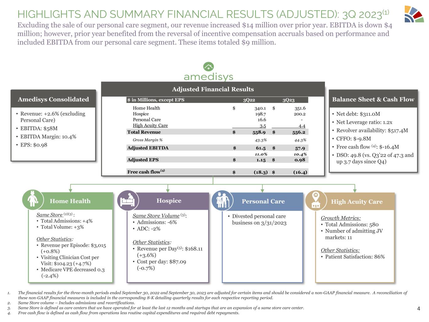 3 OUR KEY AREAS OF FOCUS Strategic areas of focus and progress made during Q3’23 • Home Health: Total same store admissions +4% • Hospice: Total same store ADC -2% • High Acuity Care: Admissions +35% over prior year 1 Organic Growth • Quality: Amedisys Jan’24 preview STARS score of 4.41 • 96% of care centers at 4+ Stars based on Jan’24 preview • 36 Amedisys care centers rated at 5 Stars in the Jan’24 preview • Hospice quality – outperforming industry average in all hospice item set (HIS) categories 3 Clinical Initiatives • Focusing on optimizing RN / LPN & PT / PTA staffing ratios. • Current LPN Ratio: 47.7% (vs. 47.5% in 3Q’22) • Current PTA Ratio: 55.0% (vs. 53.7% in 3Q’22) 4 Capacity and Productivity • Pending merger with UnitedHealth Group Inc. • Completed divestiture of Personal Care business 5 M&A 2 Recruiting / Retention • Targeting industry leading employee retention amongst all employee categories • Q3’23 Voluntary Turnover 21.4% 2023 Reimbursement • Final Hospice industry rule – Amedisys impact +3.8% increase (effective 10/1/22) • Final Home Health industry rule – Amedisys impact flat (effective 1/1/23) 2024 Reimbursement • Final Hospice industry rule – Amedisys estimated impact +3.1% increase (effective 10/1/23) • Proposed Home Health industry rule – industry estimated impact -2.2% decrease (effective 1/1/24) 6 Regulatory