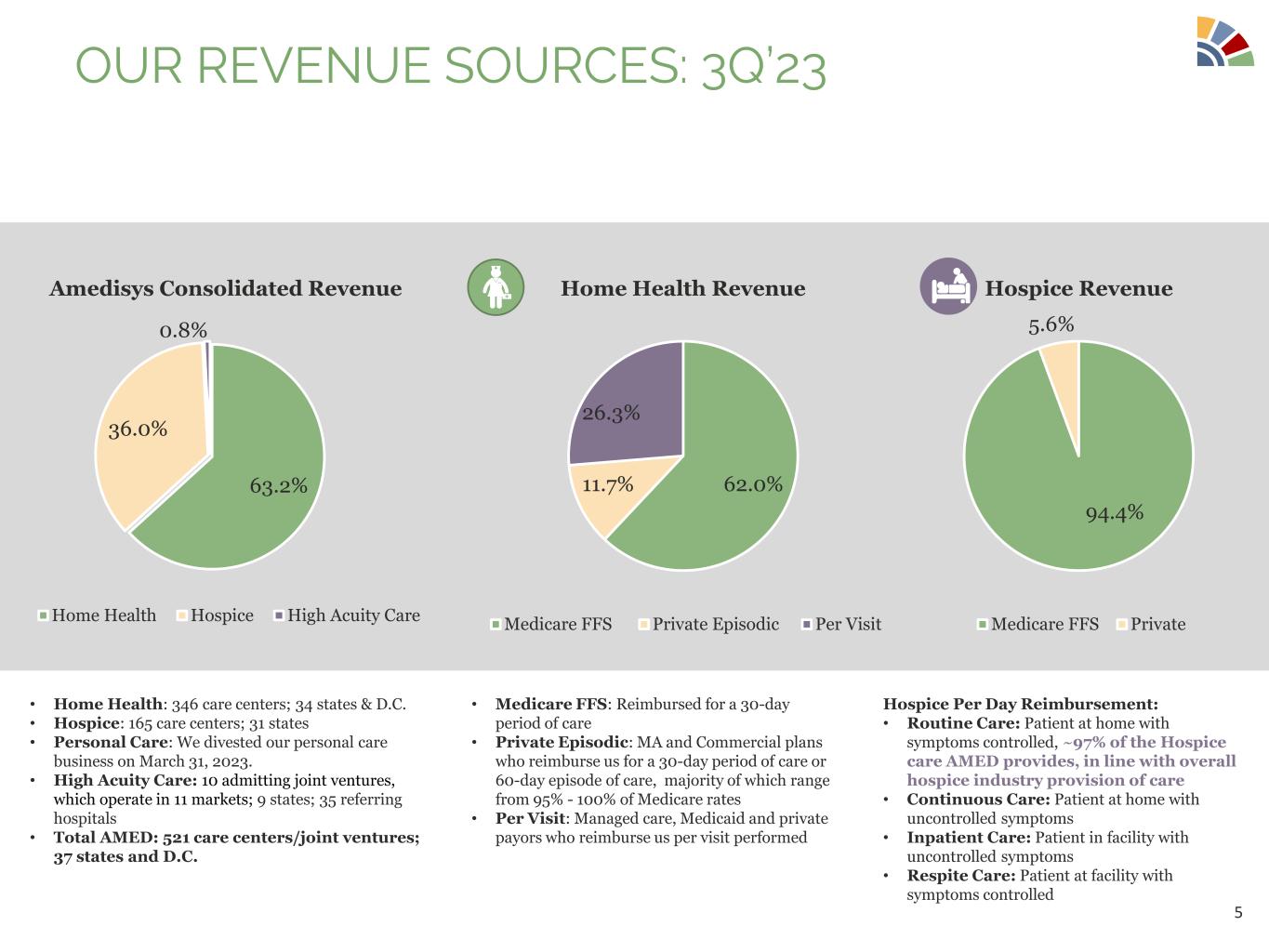 4 HIGHLIGHTS AND SUMMARY FINANCIAL RESULTS (ADJUSTED): 3Q 2023(1) Excluding the sale of our personal care segment, our revenue increased $14 million over prior year. EBITDA is down $4 million; however, prior year benefited from the reversal of incentive compensation accruals based on performance and included EBITDA from our personal care segment. These items totaled $9 million. 1. The financial results for the three-month periods ended September 30, 2022 and September 30, 2023 are adjusted for certain items and should be considered a non-GAAP financial measure. A reconciliation of these non-GAAP financial measures is included in the corresponding 8-K detailing quarterly results for each respective reporting period. 2. Same Store volume – Includes admissions and recertifications. 3. Same Store is defined as care centers that we have operated for at least the last 12 months and startups that are an expansion of a same store care center. 4. Free cash flow is defined as cash flow from operations less routine capital expenditures and required debt repayments. Growth Metrics: • Total Admissions: 580 • Number of admitting JV markets: 11 Other Statistics: • Patient Satisfaction: 86% High Acuity Care Adjusted Financial Results • Divested personal care business on 3/31/2023 Personal Care Same Store Volume (3): • Admissions: -6% • ADC: -2% Other Statistics: • Revenue per Day(5): $168.11 (+3.6%) • Cost per day: $87.09 (-0.7%) HospiceHome Health Same Store (2)(3) : • Total Admissions: +4% • Total Volume: +3% Other Statistics: • Revenue per Episode: $3,015 (+0.8%) • Visiting Clinician Cost per Visit: $104.23 (+4.7%) • Medicare VPE decreased 0.3 (-2.4%) Amedisys Consolidated • Revenue: +2.6% (excluding Personal Care) • EBITDA: $58M • EBITDA Margin: 10.4% • EPS: $0.98 Amedisys Consolidated Amedisys Consolidated Balance Sheet & Cash Flow • Net debt: $311.0M • Net Leverage ratio: 1.2x • Revolver availability: $517.4M • CFFO: $-9.8M • Free cash flow (4): $-16.4M • DSO: 49.8 (vs. Q3’22 of 47.3 and up 3.7 days since Q4) $ in Millions, except EPS 3Q22 3Q23 Home Health 340.1$ 351.6$ Hospice 198.7 200.2 Personal Care 16.6 - High Acuity Care 3.5 4.4 Total Revenue 558.9$ 556.2$ Gross Margin % 43.3% 44.3% Adjusted EBITDA 61.5$ 57.9$ 11.0% 10.4% Adjusted EPS 1.15$ 0.98$ Free cash flow(4) (18.3)$ (16.4)$