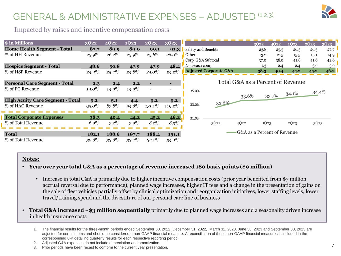 6 HOME HEALTH AND HOSPICE SEGMENT (ADJUSTED) – Q3 2023(1) • Revenue per Episode up 0.8% due to patient mix (wage index and functional score are primary drivers). Reimbursement is flat year over year. • Y/Y Total CPV up $5.21 (+4.7%) primarily due to raises, wage inflation, an increase in new hire pay, higher contractor costs (COVID-related rate increases are no longer classified as an adjusting item) and visit mix. • Excluding the reversal of incentive compensation accruals in the prior year, EBITDA margin increased 30 basis points. Home Health Highlights • Net revenue per day +3.6%; +3.8% Hospice rate update effective 10/1/2022. • Total ADC decline is due to lower admissions and 2022 care center closures (63 ADC impact). • Cost per day down $0.63 (-0.7%) primarily due to clinical optimization and reorganization initiatives and a new pharmacy contract partially offset by raises and wage inflation. • Excluding the reversal of incentive compensation accruals in the prior year, EBITDA margin increased 340 basis points. Hospice Highlights 1. The financial results for the three-month periods ended September 30, 2022 and September 30, 2023 are adjusted for certain items and should be considered a non-GAAP financial measure. A reconciliation of these non-GAAP financial measures is included in the corresponding 8-K detailing quarterly results for each respective reporting period. 2. Pre-Corporate EBITDA does not include any corporate G&A expenses. 3. Same Store information represents the percent change in volume, admissions or ADC for the period as a percent of the volume, admissions or ADC of the prior period. 4. Same Store is defined as care centers that we have operated for at least the last 12 months and startups that are an expansion of a same store care center. 5. Prior year amounts have been recast to conform to the current year presentation. $ in Millions 3Q22(5) 3Q23 Medicare 225.3$ 217.9$ Non-Medicare 114.8 133.7 Home Health Revenue $340.1 $351.6 Gross Margin % 43.1% 43.1% Pre-Corporate EBITDA(2) $58.9 $60.2 17.3% 17.1% Operating Statistics Same Store Growth(3)(4) Total admissions 5% 4% Total volume 1% 3% Medicare revenue per episode $2,992 $3,015 Medicare recert rate 33.9% 33.9% Total cost per visit $110.99 $116.20 HOME HEALTH $ in Millions 3Q22 3Q23 Medicare 187.8$ 188.9$ Non-Medicare 10.9 11.3 Hospice Revenue $198.7 $200.2 Gross Margin % 45.9% 48.2% Pre-Corporate EBITDA(2) $43.2 $48.7 21.7% 24.4% Operating Statistics Admit growth - same store(3)(4) -3% -6% ADC growth - same store(3)(4) 1% -2% ADC 13,314 12,943 Avg. discharge length of stay 92 94 Revenue per day (net)(5) $162.24 $168.11 Cost per day $87.72 $87.09