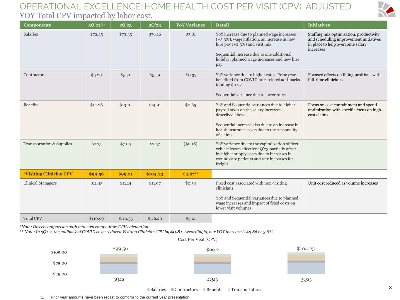 7 $ in Millions 3Q22 4Q22 1Q23 2Q23 3Q23 Home Health Segment - Total 87.7 89.9 89.0 90.1 91.3 % of HH Revenue 25.9% 26.2% 25.9% 25.8% 26.0% Hospice Segment - Total 48.6 50.8 47.9 47.9 48.4 % of HSP Revenue 24.4% 25.7% 24.8% 24.0% 24.2% Personal Care Segment - Total 2.3 2.4 2.2 - - % of PC Revenue 14.0% 14.9% 14.9% - - High Acuity Care Segment - Total 5.2 5.1 4.4 5.2 5.2 % of HAC Revenue 95.0% 87.8% 94.6% 131.1% 119.2% Total Corporate Expenses 38.3 40.4 44.2 45.2 46.2 % of Total Revenue 6.9% 7.2% 7.9% 8.2% 8.3% Total 182.1 188.6 187.7 188.4 191.1 % of Total Revenue 32.6% 33.6% 33.7% 34.1% 34.4% GENERAL & ADMINISTRATIVE EXPENSES – ADJUSTED (1,2,3) Notes: • Year over year total G&A as a percentage of revenue increased 180 basis points ($9 million) • Increase in total G&A is primarily due to higher incentive compensation costs (prior year benefited from $7 million accrual reversal due to performance), planned wage increases, higher IT fees and a change in the presentation of gains on the sale of fleet vehicles partially offset by clinical optimization and reorganization initiatives, lower staffing levels, lower travel/training spend and the divestiture of our personal care line of business • Total G&A increased ~$3 million sequentially primarily due to planned wage increases and a seasonality driven increase in health insurance costs 1. The financial results for the three-month periods ended September 30, 2022, December 31, 2022, March 31, 2023, June 30, 2023 and September 30, 2023 are adjusted for certain items and should be considered a non-GAAP financial measure. A reconciliation of these non-GAAP financial measures is included in the corresponding 8-K detailing quarterly results for each respective reporting period. 2. Adjusted G&A expenses do not include depreciation and amortization. 3. Prior periods have been recast to conform to the current year presentation. Impacted by raises and incentive compensation costs 32.6% 33.6% 33.7% 34.1% 34.4% 31.0% 33.0% 35.0% 3Q22 4Q22 1Q23 2Q23 3Q23 Total G&A as a Percent of Revenue G&A as a Percent of Revenue 3Q22 4Q22 1Q23 2Q23 3Q23 Salary and Benefits 23.8 25.5 26.3 26.5 27.7 Other 13.2 12.5 15.5 15.1 14.9 Corp. G&A Subtotal 37.0 38.0 41.8 41.6 42.6 Non-cash comp 1.3 2.4 2.4 3.6 3.6 Adjusted Corporate G&A 38.3 40.4 44.2 45.2 46.2
