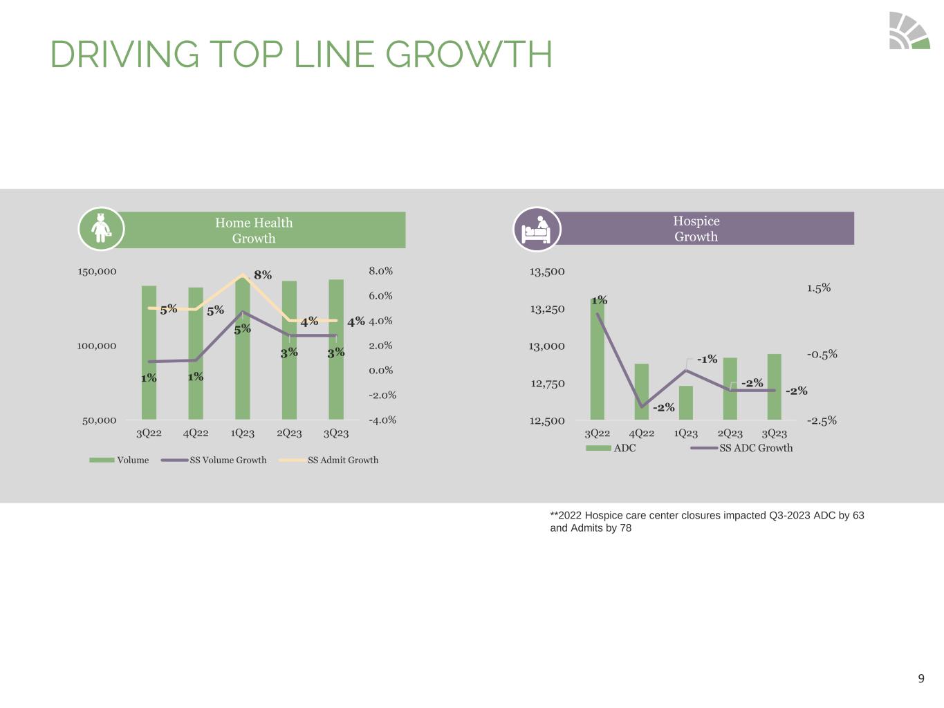 8 OPERATIONAL EXCELLENCE: HOME HEALTH COST PER VISIT (CPV)-ADJUSTED YOY Total CPV impacted by labor cost. *Note: Direct comparison with industry competitors CPV calculation ** Note: In 3Q’22, the addback of COVID costs reduced Visiting Clinician CPV by $0.81. Accordingly, our YOY increase is $3.86 or 3.8% $99.56 $99.21 $104.23 Components 3Q’22(1) 2Q’23 3Q’23 YoY Variance Detail Initiatives Salaries $72.35 $73.35 $76.16 $3.81 YoY increase due to planned wage increases (+3.3%), wage inflation, an increase in new hire pay (+2.3%) and visit mix Sequential increase due to one additional holiday, planned wage increases and new hire pay Staffing mix optimization, productivity and scheduling improvement initiatives in place to help overcome salary increases Contractors $5.20 $5.71 $5.59 $0.39 YoY variance due to higher rates. Prior year benefited from COVID rate-related add-backs totaling $0.72 Sequential variance due to lower rates Focused efforts on filling positions with full-time clinicians Benefits $14.26 $13.10 $14.91 $0.65 YoY and Sequential variances due to higher payroll taxes on the salary increases described above Sequential increase also due to an increase in health insurance costs due to the seasonality of claims Focus on cost containment and spend optimization with specific focus on high- cost claims Transportation & Supplies $7.75 $7.05 $7.57 ($0.18) YoY variance due to the capitalization of fleet vehicle leases effective 1Q’23 partially offset by higher supply costs due to increases in wound care patients and rate increases for freight *Visiting Clinician CPV $99.56 $99.21 $104.23 $4.67** Clinical Managers $11.43 $11.14 $11.97 $0.54 Fixed cost associated with non-visiting clinicians YoY and Sequential variances due to planned wage increases and impact of fixed costs on lower visit volumes Unit cost reduced as volume increases Total CPV $110.99 $110.35 $116.20 $5.21 1. Prior year amounts have been recast to conform to the current year presentation. $45.00 $75.00 $105.00 3Q22 2Q23 3Q23 Cost Per Visit (CPV) Salaries Contractors Benefits Transportation