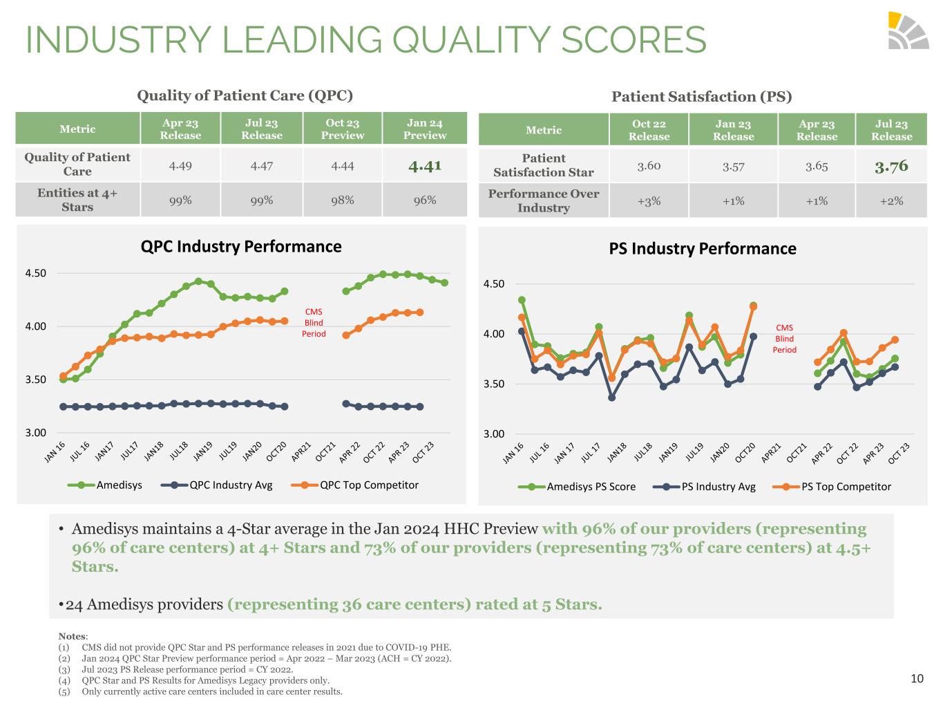 9 DRIVING TOP LINE GROWTH 1% 1% 5% 3% 3% 5% 5% 8% 4% 4% -4.0% -2.0% 0.0% 2.0% 4.0% 6.0% 8.0% 50,000 100,000 150,000 3Q22 4Q22 1Q23 2Q23 3Q23 Volume SS Volume Growth SS Admit Growth Home Health Growth Hospice Growth 1% -2% -1% -2% -2% -2.5% -0.5% 1.5% 12,500 12,750 13,000 13,250 13,500 3Q22 4Q22 1Q23 2Q23 3Q23 ADC SS ADC Growth **2022 Hospice care center closures impacted Q3-2023 ADC by 63 and Admits by 78