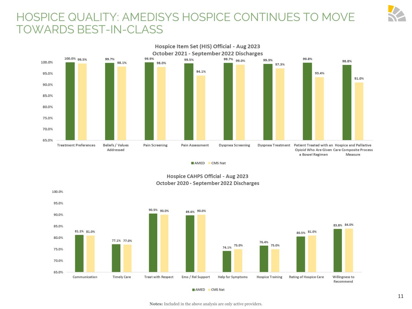 10 INDUSTRY LEADING QUALITY SCORES Quality of Patient Care (QPC) Patient Satisfaction (PS) • Amedisys maintains a 4-Star average in the Jan 2024 HHC Preview with 96% of our providers (representing 96% of care centers) at 4+ Stars and 73% of our providers (representing 73% of care centers) at 4.5+ Stars. •24 Amedisys providers (representing 36 care centers) rated at 5 Stars. Notes: (1) CMS did not provide QPC Star and PS performance releases in 2021 due to COVID-19 PHE. (2) Jan 2024 QPC Star Preview performance period = Apr 2022 – Mar 2023 (ACH = CY 2022). (3) Jul 2023 PS Release performance period = CY 2022. (4) QPC Star and PS Results for Amedisys Legacy providers only. (5) Only currently active care centers included in care center results. Metric Apr 23 Release Jul 23 Release Oct 23 Preview Jan 24 Preview Quality of Patient Care 4.49 4.47 4.44 4.41 Entities at 4+ Stars 99% 99% 98% 96% 3.00 3.50 4.00 4.50 QPC Industry Performance Amedisys QPC Industry Avg QPC Top Competitor CMS Blind Period 3.00 3.50 4.00 4.50 PS Industry Performance Amedisys PS Score PS Industry Avg PS Top Competitor CMS Blind Period Metric Oct 22 Release Jan 23 Release Apr 23 Release Jul 23 Release Patient Satisfaction Star 3.60 3.57 3.65 3.76 Performance Over Industry +3% +1% +1% +2%