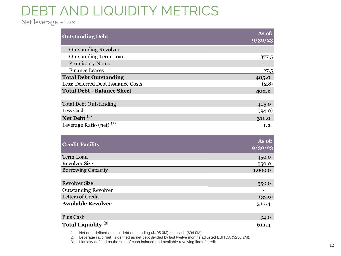 12 DEBT AND LIQUIDITY METRICS Net leverage ~1.2x 1. Net debt defined as total debt outstanding ($405.0M) less cash ($94.0M). 2. Leverage ratio (net) is defined as net debt divided by last twelve months adjusted EBITDA ($250.2M). 3. Liquidity defined as the sum of cash balance and available revolving line of credit. Outstanding Revolver - Outstanding Term Loan 377.5 Promissory Notes - Finance Leases 27.5 Total Debt Outstanding 405.0 Less: Deferred Debt Issuance Costs (2.8) Total Debt - Balance Sheet 402.2 Total Debt Outstanding 405.0 Less Cash (94.0) Net Debt (1) 311.0 Leverage Ratio (net) (2) 1.2 Term Loan 450.0 Revolver Size 550.0 Borrowing Capacity 1,000.0 Revolver Size 550.0 Outstanding Revolver - Letters of Credit (32.6) Available Revolver 517.4 Plus Cash 94.0 Total Liquidity (3) 611.4 As of: 9/30/23 Credit Facility Outstanding Debt As of: 9/30/23