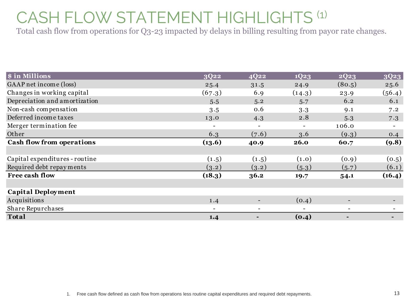 13 CASH FLOW STATEMENT HIGHLIGHTS (1) Total cash flow from operations for Q3-23 impacted by delays in billing resulting from payor rate changes. 1. Free cash flow defined as cash flow from operations less routine capital expenditures and required debt repayments. $ in Millions 3Q22 4Q22 1Q23 2Q23 3Q23 GAAP net income (loss) 25.4 31 .5 24.9 (80.5) 25.6 Changes in working capital (67 .3) 6.9 (1 4.3) 23 .9 (56.4) Depreciation and amortization 5.5 5.2 5.7 6.2 6.1 Non-cash compensation 3.5 0.6 3 .3 9.1 7 .2 Deferred income taxes 1 3.0 4.3 2 .8 5.3 7 .3 Merger termination fee - - - 1 06.0 - Other 6.3 (7 .6) 3 .6 (9.3) 0.4 Cash flow from operations (13.6) 40.9 26.0 60.7 (9.8) Capital expenditures - routine (1 .5) (1 .5) (1 .0) (0.9) (0.5) Required debt repay ments (3.2) (3 .2) (5.3) (5.7 ) (6.1 ) Free cash flow (18.3) 36.2 19.7 54.1 (16.4) Capital Deployment Acquisitions 1 .4 - (0.4) - - Share Repurchases - - - - - Total 1.4 - (0.4) - -