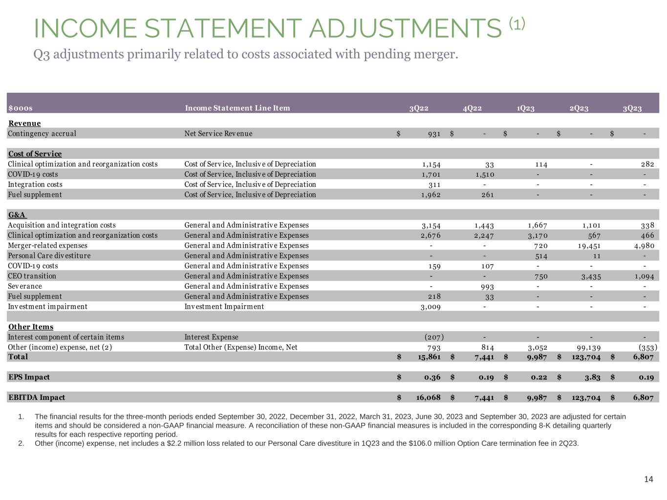 14 INCOME STATEMENT ADJUSTMENTS (1) 1. The financial results for the three-month periods ended September 30, 2022, December 31, 2022, March 31, 2023, June 30, 2023 and September 30, 2023 are adjusted for certain items and should be considered a non-GAAP financial measure. A reconciliation of these non-GAAP financial measures is included in the corresponding 8-K detailing quarterly results for each respective reporting period. 2. Other (income) expense, net includes a $2.2 million loss related to our Personal Care divestiture in 1Q23 and the $106.0 million Option Care termination fee in 2Q23. Q3 adjustments primarily related to costs associated with pending merger. $000s Income Statement Line Item 3Q22 4Q22 1Q23 2Q23 3Q23 Revenue Contingency accrual Net Serv ice Rev enue 931$ -$ -$ -$ -$ Cost of Service Clinical optimization and reorganization costs Cost of Serv ice, Inclusiv e of Depreciation 1 ,1 54 33 1 1 4 - 282 COVID-1 9 costs Cost of Serv ice, Inclusiv e of Depreciation 1 ,7 01 1 ,51 0 - - - Integration costs Cost of Serv ice, Inclusiv e of Depreciation 31 1 - - - - Fuel supplement Cost of Serv ice, Inclusiv e of Depreciation 1 ,962 261 - - - G&A Acquisition and integration costs General and Administrativ e Expenses 3,1 54 1 ,443 1 ,667 1 ,1 01 338 Clinical optimization and reorganization costs General and Administrativ e Expenses 2,67 6 2 ,247 3 ,1 7 0 567 466 Merger-related expenses General and Administrativ e Expenses - - 7 20 1 9,451 4,980 Personal Care div estiture General and Administrativ e Expenses - - 51 4 1 1 - COVID-1 9 costs General and Administrativ e Expenses 1 59 1 07 - - - CEO transition General and Administrativ e Expenses - - 7 50 3 ,435 1 ,094 Sev erance General and Administrativ e Expenses - 993 - - - Fuel supplement General and Administrativ e Expenses 21 8 33 - - - Inv estment impairment Inv estment Impairment 3,009 - - - - Other Items Interest component of certain items Interest Expense (207 ) - - - - Other (income) expense, net (2) Total Other (Expense) Income, Net 7 93 81 4 3 ,052 99,1 39 (353) Total 15,861$ 7 ,441$ 9,987$ 123,704$ 6,807$ EPS Impact 0.36$ 0.19$ 0.22$ 3.83$ 0.19$ EBITDA Impact 16,068$ 7 ,441$ 9,987$ 123,704$ 6,807$