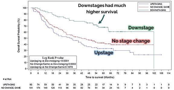 Another finding presented at ESMO is also very important because it predicts improved survival. This finding refers to pre-surgery disease downstaging, which is when the physician assesses a lower stage of disease after Multikine therapy compared to before Multikine therapy. The graph below clearly indicates that Multikine-treated patients with downstaging (improved disease, the green top line) have much better survival. This data is strongly significant as a statistical matter, with a p-value below 0.0002.