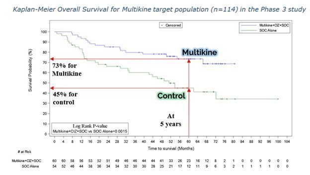 | · | Third, Multikine patients in the target population saw a significant increase in 5-year overall survival, from 45% for control patients who did not receive Multikine to 73% for Multikine-treated patients, shown in the graph below. |