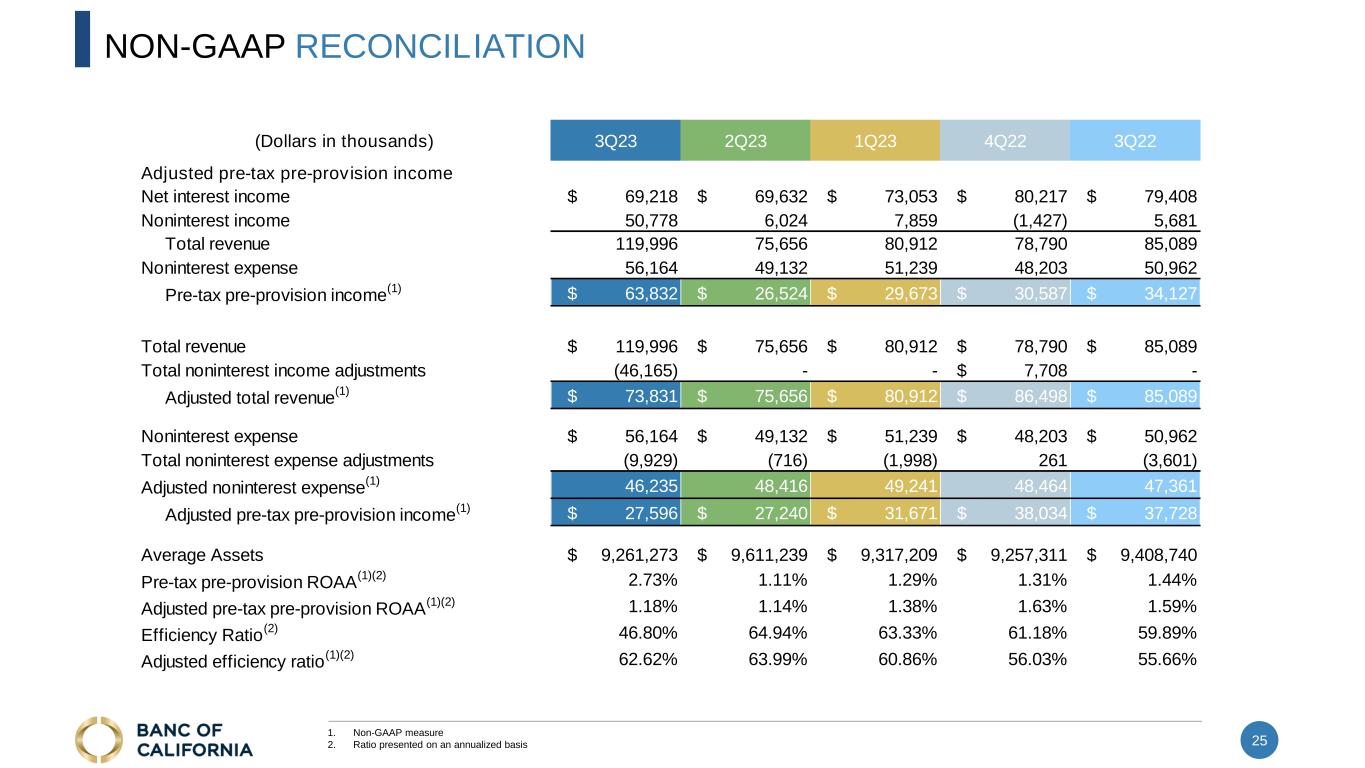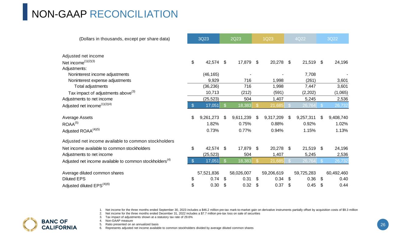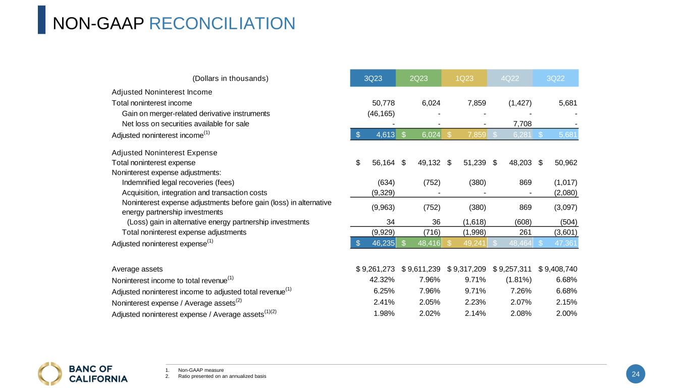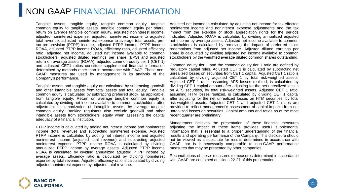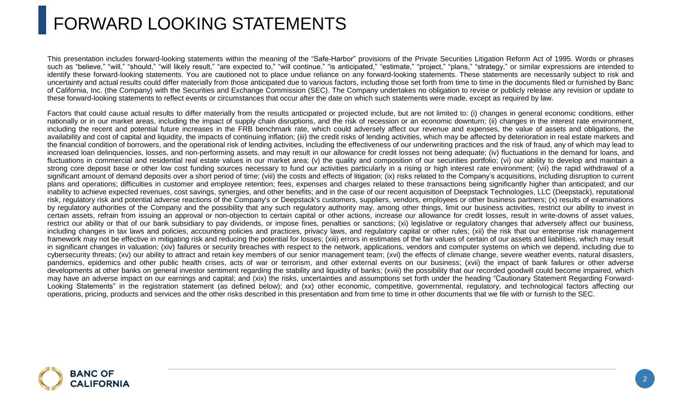 This document includes forward-looking statements within the meaning of the “Safe-Harbor” provisions of the Private Securities Litigation Reform Act of 1995. Words or phrases such as “believe,” “will,” “should,” “will likely result,” “are expected to,” “will continue,” “is anticipated,” “estimate,” “project,” “plans,” “strategy,” or similar expressions are intended to identify these forward-looking statements. You are cautioned not to place undue reliance on any forward-looking statements. These statements are necessarily subject to risk and uncertainty and actual results could differ materially from those anticipated due to various factors, including those set forth from time to time in the documents filed or furnished by Banc of California, Inc. (the Company) with the Securities and Exchange Commission (SEC). The Company undertakes no obligation to revise or publicly release any revision or update to these forward-looking statements to reflect events or circumstances that occur after the date on which such statements were made, except as required by law.