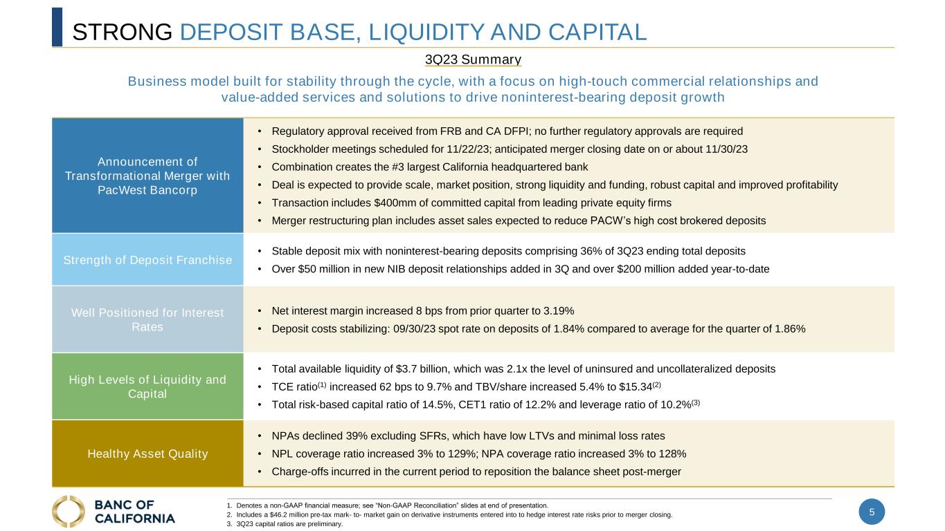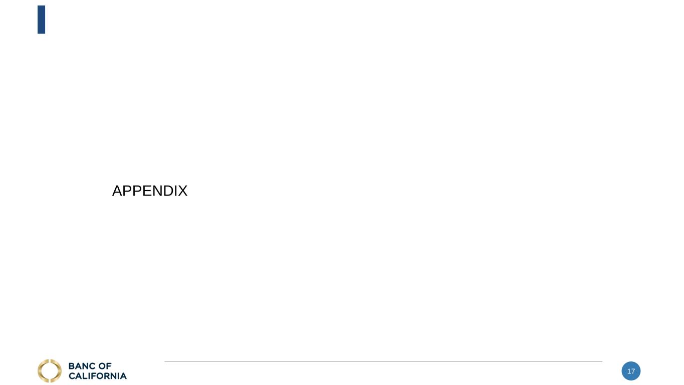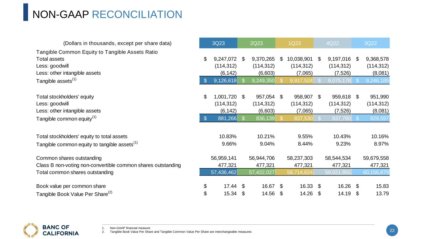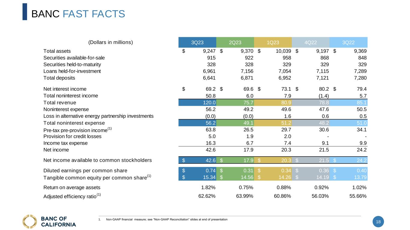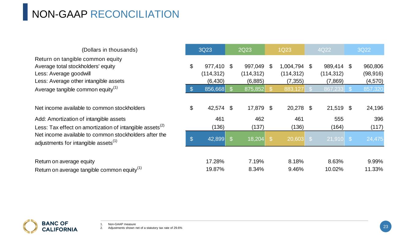 This document includes forward-looking statements within the meaning of the “Safe-Harbor” provisions of the Private Securities Litigation Reform Act of 1995. Words or phrases such as “believe,” “will,” “should,” “will likely result,” “are expected to,” “will continue,” “is anticipated,” “estimate,” “project,” “plans,” “strategy,” or similar expressions are intended to identify these forward-looking statements. You are cautioned not to place undue reliance on any forward-looking statements. These statements are necessarily subject to risk and uncertainty and actual results could differ materially from those anticipated due to various factors, including those set forth from time to time in the documents filed or furnished by Banc of California, Inc. (the Company) with the Securities and Exchange Commission (SEC). The Company undertakes no obligation to revise or publicly release any revision or update to these forward-looking statements to reflect events or circumstances that occur after the date on which such statements were made, except as required by law.