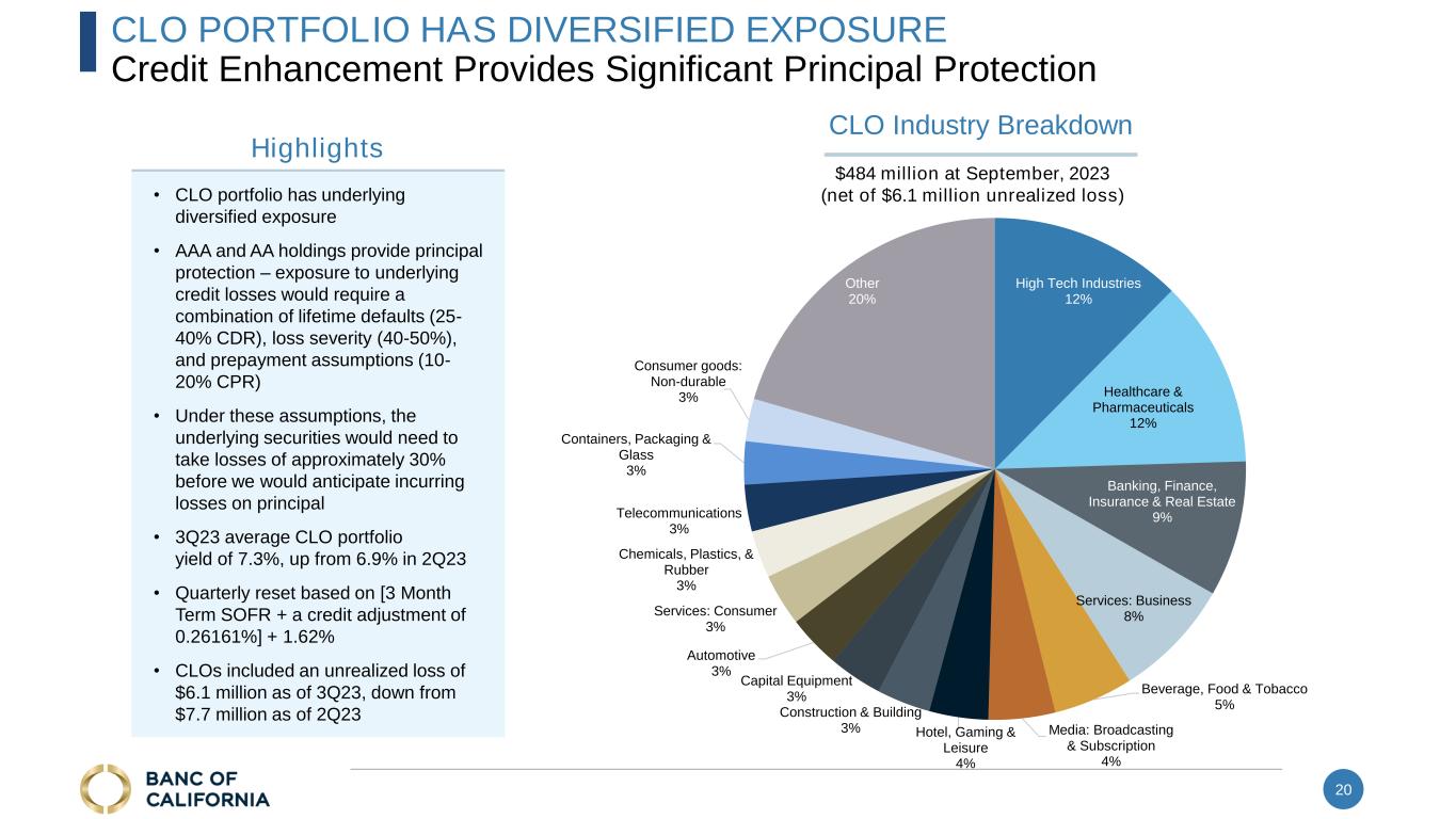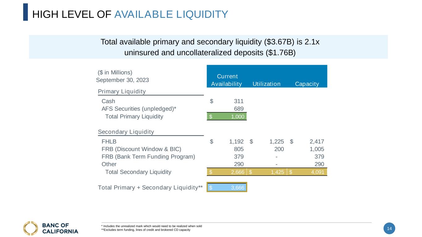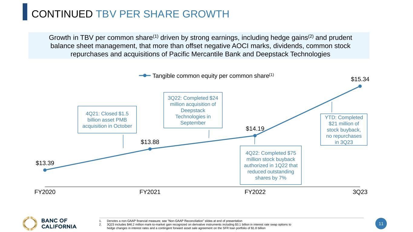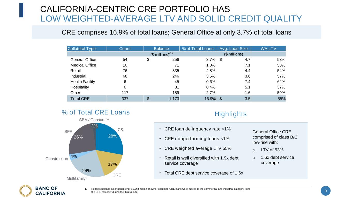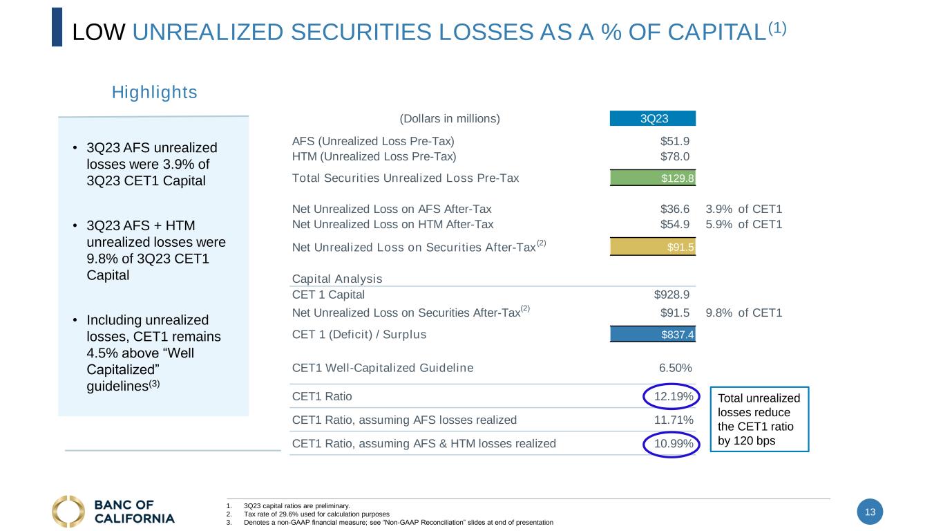 This document includes forward-looking statements within the meaning of the “Safe-Harbor” provisions of the Private Securities Litigation Reform Act of 1995. Words or phrases such as “believe,” “will,” “should,” “will likely result,” “are expected to,” “will continue,” “is anticipated,” “estimate,” “project,” “plans,” “strategy,” or similar expressions are intended to identify these forward-looking statements. You are cautioned not to place undue reliance on any forward-looking statements. These statements are necessarily subject to risk and uncertainty and actual results could differ materially from those anticipated due to various factors, including those set forth from time to time in the documents filed or furnished by Banc of California, Inc. (the Company) with the Securities and Exchange Commission (SEC). The Company undertakes no obligation to revise or publicly release any revision or update to these forward-looking statements to reflect events or circumstances that occur after the date on which such statements were made, except as required by law.