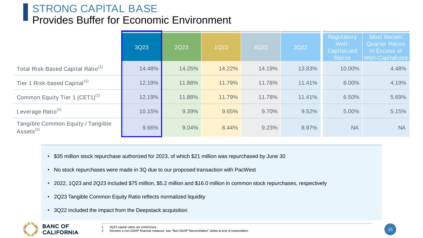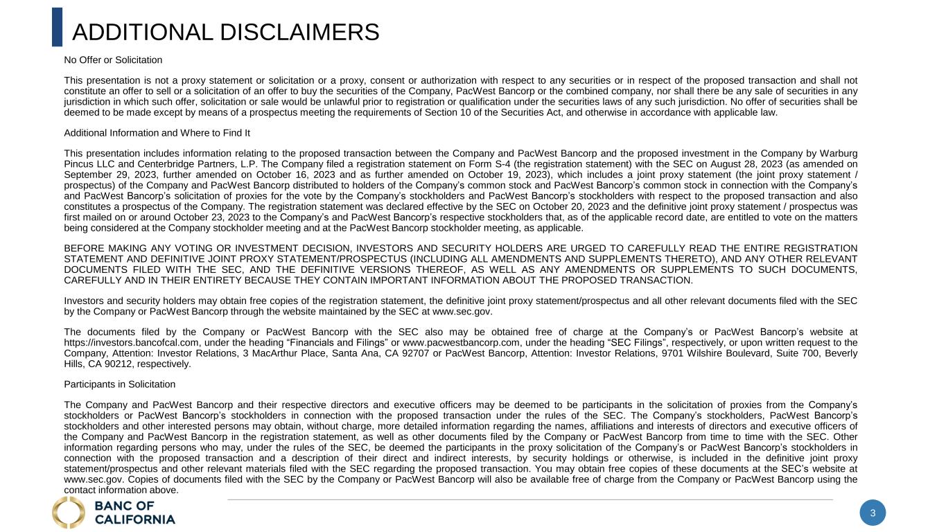 This document includes information relating to the proposed transaction between the Company and PacWest Bancorp and the proposed investment in the Company by Warburg Pincus LLC and Centerbridge Partners, L.P. The Company filed a registration statement on Form S-4 (the registration statement) with the SEC on August 28, 2023 (as amended on September 29, 2023, further amended on October 16, 2023 and as further amended on October 19, 2023), which includes a joint proxy statement (the joint proxy statement / prospectus) of the Company and PacWest Bancorp distributed to holders of the Company’s common stock and PacWest Bancorp’s common stock in connection with the Company’s and PacWest Bancorp’s solicitation of proxies for the vote by the Company’s stockholders and PacWest Bancorp’s stockholders with respect to the proposed transaction and also constitutes a prospectus of the Company. The registration statement was declared effective by the SEC on October 20, 2023 and the definitive joint proxy statement / prospectus was first mailed on or around October 23, 2023 to the Company’s and PacWest Bancorp’s respective stockholders that, as of the applicable record date, are entitled to vote on the matters being considered at the Company stockholder meeting and at the PacWest Bancorp stockholder meeting, as applicable.