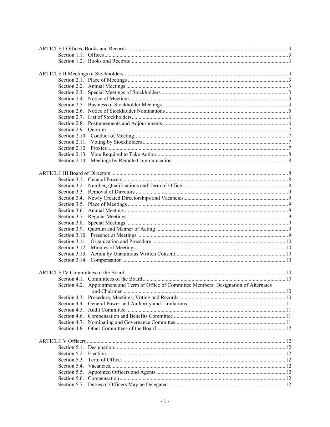 - 1 - ARTICLE I Offices, Books and Records ...................................................................................................................... 3 Section 1.1. Offices ....................................................................................................................................... 3 Section 1.2. Books and Records .................................................................................................................... 3 ARTICLE II Meetings of Stockholders ......................................................................................................................... 3 Section 2.1. Place of Meetings ...................................................................................................................... 3 Section 2.2. Annual Meetings ....................................................................................................................... 3 Section 2.3. Special Meetings of Stockholders ............................................................................................. 3 Section 2.4. Notice of Meetings .................................................................................................................... 3 Section 2.5. Business of Stockholder Meetings ............................................................................................ 3 Section 2.6. Notice of Stockholder Nominations .......................................................................................... 5 Section 2.7. List of Stockholders ................................................................................................................... 6 Section 2.8. Postponements and Adjournments ............................................................................................ 6 Section 2.9. Quorum ...................................................................................................................................... 7 Section 2.10. Conduct of Meeting ................................................................................................................. 7 Section 2.11. Voting by Stockholders ........................................................................................................... 7 Section 2.12. Proxies ..................................................................................................................................... 7 Section 2.13. Vote Required to Take Action ................................................................................................. 8 Section 2.14. Meetings by Remote Communication ..................................................................................... 8 ARTICLE III Board of Directors .................................................................................................................................. 8 Section 3.1. General Powers .......................................................................................................................... 8 Section 3.2. Number, Qualifications and Term of Office .............................................................................. 8 Section 3.3. Removal of Directors ................................................................................................................ 9 Section 3.4. Newly Created Directorships and Vacancies ............................................................................. 9 Section 3.5. Place of Meetings ...................................................................................................................... 9 Section 3.6. Annual Meeting ......................................................................................................................... 9 Section 3.7. Regular Meetings....................................................................................................................... 9 Section 3.8. Special Meetings ....................................................................................................................... 9 Section 3.9. Quorum and Manner of Acting ................................................................................................. 9 Section 3.10. Presence at Meetings ............................................................................................................... 9 Section 3.11. Organization and Procedure .................................................................................................. 10 Section 3.12. Minutes of Meetings .............................................................................................................. 10 Section 3.13. Action by Unanimous Written Consent ................................................................................. 10 Section 3.14. Compensation ........................................................................................................................ 10 ARTICLE IV Committees of the Board ...................................................................................................................... 10 Section 4.1. Committees of the Board ......................................................................................................... 10 Section 4.2. Appointment and Term of Office of Committee Members; Designation of Alternates and Chairmen ....................................................................................................................... 10 Section 4.3. Procedure, Meetings, Voting and Records .............................................................................. 10 Section 4.4. General Power and Authority and Limitations ........................................................................ 11 Section 4.5. Audit Committee ..................................................................................................................... 11 Section 4.6. Compensation and Benefits Committee .................................................................................. 11 Section 4.7. No