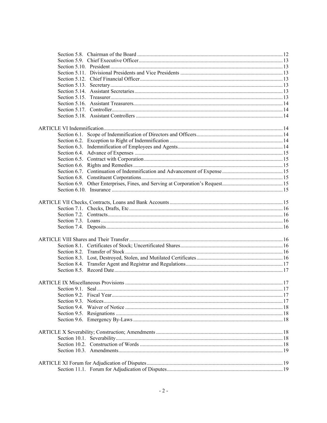 - 2 - Section 5.8. Chairman of the Board ............................................................................................................ 12 Section 5.9. Chief Executive Officer ........................................................................................................... 13 Section 5.10. President ................................................................................................................................ 13 Section 5.11. Divisional Presidents and Vice Presidents ............................................................................ 13 Section 5.12. Chief Financial Officer .......................................................................................................... 13 Section 5.13. Secretary ................................................................................................................................ 13 Section 5.14. Assistant Secretaries .............................................................................................................. 13 Section 5.15. Treasurer ................................................................................................................................ 13 Section 5.16. Assistant Treasurers............................................................................................................... 14 Section 5.17. Controller............................................................................................................................... 14 Section 5.18. Assistant Controllers ............................................................................................................. 14 ARTICLE VI Indemnification ..................................................................................................................................... 14 Section 6.1. Scope of Indemnification of Directors and Officers ................................................................ 14 Section 6.2. Exception to Right of Indemnification .................................................................................... 14 Section 6.3. Indemnification of Employees and Agents .............................................................................. 14 Section 6.4. Advance of Expenses .............................................................................................................. 15 Section 6.5. Contract with Corporation ....................................................................................................... 15 Section 6.6. Rights and Remedies ............................................................................................................... 15 Section 6.7. Continuation of Indemnification and Advancement of Expense ............................................. 15 Section 6.8. Constituent Corporations ......................................................................................................... 15 Section 6.9. Other Enterprises, Fines, and Serving at Corporation’s Request ............................................. 15 Section 6.10. Insurance ............................................................................................................................... 15 ARTICLE VII Checks, Contracts, Loans and Bank Accounts .................................................................................... 15 Section 7.1. Checks, Drafts, Etc .................................................................................................................. 16 Section 7.2. Contracts .................................................................................................................................. 16 Section 7.3. Loans ....................................................................................................................................... 16 Section 7.4. Deposits ................................................................................................................................... 16 ARTICLE VIII Shares and Their Transfer .................................................................................................................. 16 Section 8.1. Certificates of Stock; Uncertificated Shares ............................................................................ 16 Section 8.2. Transfer of Stock ..................................................................................................................... 16 Section 8.3. Lost, Destroyed, Stolen, and Mutilated Certificates ................................................................ 16 Section 8.4. Transfer Agent and Registrar and Regulations ........................................................................ 17 Section 8.5. Record Date ............................................................................................................................. 17 ARTICLE IX Miscellaneous Provisions ..................................................................................................................... 17 Section 9.1. Seal .......................................................................................................................................... 17 Section 9.2. Fiscal Year ............................................................................................................................... 17 Section 9.3. Notices ..................................................................................................................................... 17 Section 9.4. Waiver of Notice ..................................................................................................................... 18 Section 9.5. Resignations ............................................................................................................................ 18 Section 9.6. Emergency By-Laws ............................................................................................................... 18 ARTICLE X Severability; Construction; Amendments ..................