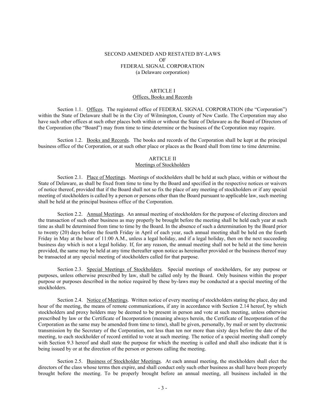 - 3 - SECOND AMENDED AND RESTATED BY-LAWS OF FEDERAL SIGNAL CORPORATION (a Delaware corporation) ARTICLE I Offices, Books and Records Section 1.1. Offices. The registered office of FEDERAL SIGNAL CORPORATION (the “Corporation”) within the State of Delaware shall be in the City of Wilmington, County of New Castle. The Corporation may also have such other offices at such other places both within or without the State of Delaware as the Board of Directors of the Corporation (the “Board”) may from time to time determine or the business of the Corporation may require. Section 1.2. Books and Records. The books and records of the Corporation shall be kept at the principal business office of the Corporation, or at such other place or places as the Board shall from time to time determine. ARTICLE II Meetings of Stockholders Section 2.1. Place of Meetings. Meetings of stockholders shall be held at such place, within or without the State of Delaware, as shall be fixed from time to time by the Board and specified in the respective notices or waivers of notice thereof, provided that if the Board shall not so fix the place of any meeting of stockholders or if any special meeting of stockholders is called by a person or persons other than the Board pursuant to applicable law, such meeting shall be held at the principal business office of the Corporation. Section 2.2. Annual Meetings. An annual meeting of stockholders for the purpose of electing directors and the transaction of such other business as may properly be brought before the meeting shall be held each year at such time as shall be determined from time to time by the Board. In the absence of such a determination by the Board prior to twenty (20) days before the fourth Friday in April of each year, such annual meeting shall be held on the fourth Friday in May at the hour of 11:00 A.M., unless a legal holiday, and if a legal holiday, then on the next succeeding business day which is not a legal holiday. If, for any reason, the annual meeting shall not be held at the time herein provided, the same may be held at any time thereafter upon notice as hereinafter provided or the business thereof may be transacted at any special meeting of stockholders called for that purpose. Section 2.3. Special Meetings of Stockholders. Special meetings of stockholders, for any purpose or purposes, unless otherwise prescribed by law, shall be called only by the Board. Only business within the proper purpose or purposes described in the notice required by these by-laws may be conducted at a special meeting of the stockholders. Section 2.4. Notice of Meetings. Written notice of every meeting of stockholders stating the place, day and hour of the meeting, the means of remote communications, if any in accordance with Section 2.14 hereof, by which stockholders and proxy holders may be deemed to be present in person and vote at such meeting, unless otherwise prescribed by law or the Certificate of Incorporation (meaning always herein, the Certificate of Incorporation of the Corporation as the same may be amended from time to time), shall be given, personally, by mail or sent by electronic transmission by the Secretary of the Corporation, not less than ten nor more than sixty days before the date of the meeting, to each stockholder of record entitled to vote at such meeting. The notice of a special meeting shall comply with Section 9.3 hereof and shall state the purpose for which the meeting is called and shall also indicate that it is being issued by or at the direction of the person or persons calling the meeting. Section 2.5. Business of Stockholder Meetings. At each annual meeting, the stockholders shall elect the directors of the class whose terms then expire, and shall conduct only such other business as shall have been properly brought before the meeting. To be properly brought before an annual meeting, all business included in the