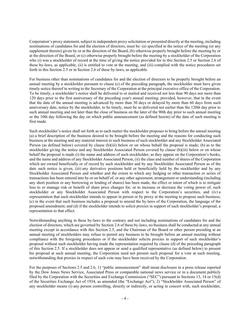 - 5 - (ii) any beneficial owner of shares of stock of the Corporation owned of record or beneficially by such stockholder and (iii) any person controlling, controlled by or under common control with such Stockholder Associated Person; and 3) to be considered a “qualified representative” of the stockholder, a person must be a duly authorized officer, manager or partner of such stockholder or must be authorized by a writing executed by such stockholder or an electronic transmission delivered by such stockholder to act for such stockholder as proxy at the meeting of stockholders and such person must produce such writing or electronic transmission, or a reliable reproduction of the writing or electronic transmission, at the meeting of stockholders. Notwithstanding the foregoing provisions of this Section 2.5, a stockholder seeking to include a proposal in a proxy statement that has been prepared by the Corporation to solicit proxies for an annual meeting shall comply with all applicable requirements of the Exchange Act and the rules and regulations thereunder with respect to the matters set forth in this Section 2.5. In no event shall the adjournment of a meeting commence a new time period for the giving of a stockholder’s notice as described in this Section 2.5. Section 2.6. Notice of Stockholder Nominations. Nominations of persons for election as directors may be made by the Board or by any stockholder who is a stockholder of record at the time of giving the notice of nomination provided for in this Section 2.6 and who is entitled to vote in the election of directors. Any stockholder of record entitled to vote in the election of directors at a meeting may nominate a person or persons for election as directors only if timely written notice of such stockholder’s intent to make such nomination is given to the Secretary of the Corporation at the principal executive office of the Corporation in accordance with the procedures for bringing nominations before an annual meeting set forth in this Section 2.6. To be timely, a stockholder’s notice shall be postmarked or transmitted electronically (a) with respect to an election to be held at an annual meeting of stockholders, not less than 90 days nor more than 120 days prior to the first anniversary of the preceding year’s annual meeting; provided, however, that in the event that the date of the annual meeting is advanced by more than 30 days or delayed by more than 60 days from such anniversary date, notice by the stockholder, to be timely, must be so delivered not earlier than the 120th day prior to such annual meeting and not later than the close of business on the later of the 90th day prior to such annual meeting or the 10th day following the day on which public announcement (as defined in Section 2.5 of these by-laws) is first made of the date of such meeting, and (b) with respect to an election to be held at a special meeting of stockholders, not earlier than the 120th day prior to such special meeting and not later than the close of business on the later of the 90th day prior to such special meeting or the 10th day following the day on which public announcement is first made of the date of the special meeting and of the nominees to be elected at such meeting. Such stockholder’s notice shall set forth: (a) the name and address of the stockholder who intends to make the nomination as they appear on the Corporation’s books, the person or persons to be nominated and the name and address of any Stockholder Associated Person (as defined in Section 2.5) covered by clause (c) below or on whose behalf the nomination is made; (b) a representation that the stockholder is a holder of record of stock of the Corporation entitled to vote at such meeting in such election and intends to appear in person or by proxy at the meeting to nominate the person or persons specified in the notice; (c) (i) the class and number of shares of the Corporation which are owned beneficially or of record by such stockholder and by any Stockholder Associated Person as of the date such notice is given and (ii) any derivative positions held or beneficially held by the stockholder and by any Stockholder Associated Person and whether and the extent to which any hedging or other transaction or series of transactions has been entered into by or on behalf of, or any other agreement, arrangement or understanding (including any short position or any borrowing or lending of shares) has been made, the effect or intent of which is to mitigate loss to or manage risk or benefit of share price changes for, or to increase or decrease the voting power of, such stockholder or any Stockholder Associated Person with respect to the Corporation’s securities; (d) a description of all arrangements or understandings between or among the stockholder, any Stockholder Associated Person, each nominee and any other person or persons (naming such person or persons) pursuant to which the nomination or nominations are to be made by the stockholder; (e) such other information regarding each nominee proposed by such stockholder as would have been required to be disclosed in solicitations of proxies for election of directors in an election contest (even if an election contest is not involved), or is otherwise required, in each case pursuant to Regulation 14A (or any successor provision) under the Exchange Act; (f) the consent of each nominee to serve as a director if so elected; and (g) a representation that such