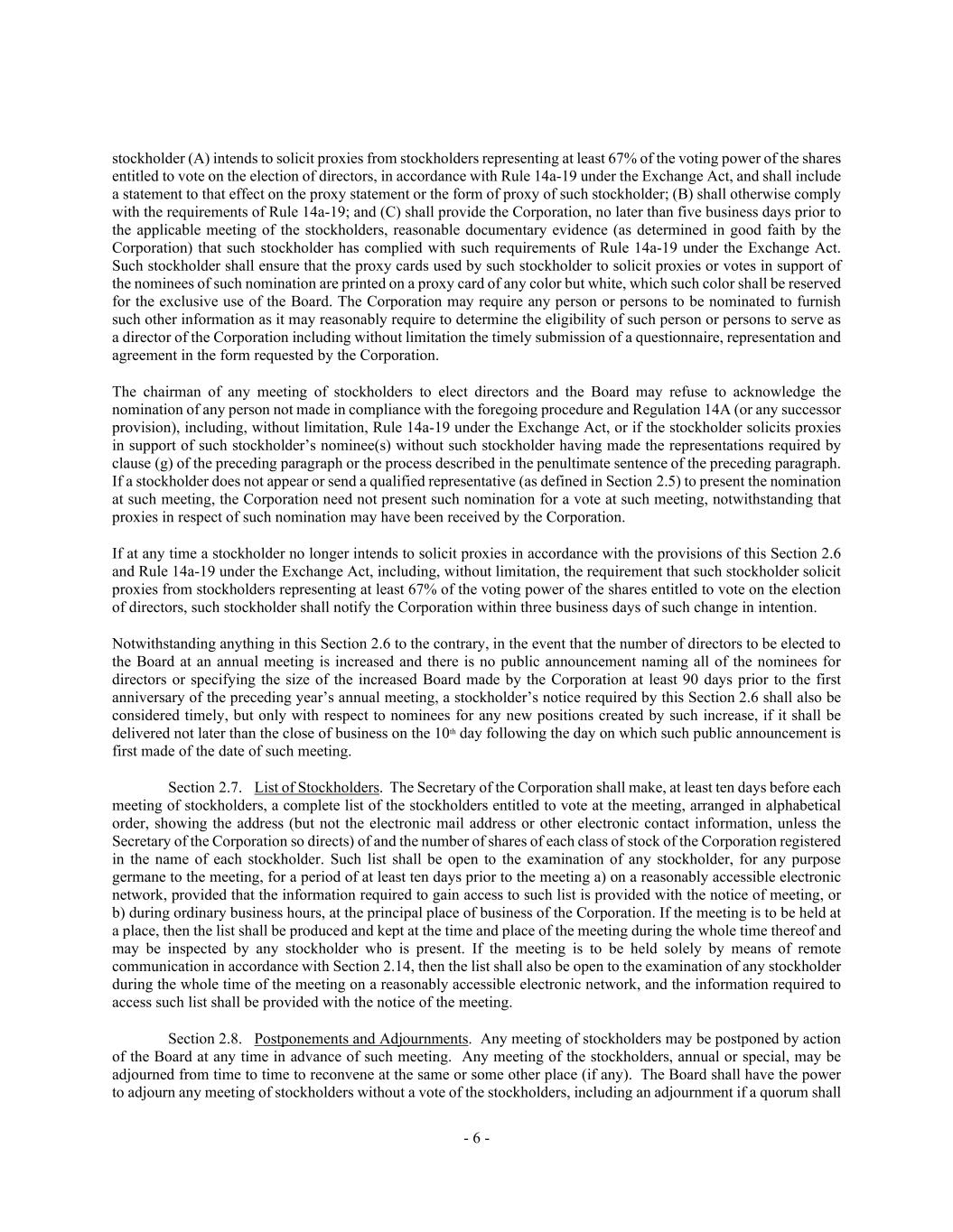 - 6 - stockholder (A) intends to solicit proxies from stockholders representing at least 67% of the voting power of the shares entitled to vote on the election of directors, in accordance with Rule 14a-19 under the Exchange Act, and shall include a statement to that effect on the proxy statement or the form of proxy of such stockholder; (B) shall otherwise comply with the requirements of Rule 14a-19; and (C) shall provide the Corporation, no later than five business days prior to the applicable meeting of the stockholders, reasonable documentary evidence (as determined in good faith by the Corporation) that such stockholder has complied with such requirements of Rule 14a-19 under the Exchange Act. Such stockholder shall ensure that the proxy cards used by such stockholder to solicit proxies or votes in support of the nominees of such nomination are printed on a proxy card of any color but white, which such color shall be reserved for the exclusive use of the Board. The Corporation may require any person or persons to be nominated to furnish such other information as it may reasonably require to determine the eligibility of such person or persons to serve as a director of the Corporation including without limitation the timely submission of a questionnaire, representation and agreement in the form requested by the Corporation. The chairman of any meeting of stockholders to elect directors and the Board may refuse to acknowledge the nomination of any person not made in compliance with the foregoing procedure and Regulation 14A (or any successor provision), including, without limitation, Rule 14a-19 under the Exchange Act, or if the stockholder solicits proxies in support of such stockholder’s nominee(s) without such stockholder having made the representations required by clause (g) of the preceding paragraph or the process described in the penultimate sentence of the preceding paragraph. If a stockholder does not appear or send a qualified representative (as defined in Section 2.5) to present the nomination at such meeting, the Corporation need not present such nomination for a vote at such meeting, notwithstanding that proxies in respect of such nomination may have been received by the Corporation. If at any time a stockholder no longer intends to solicit proxies in accordance with the provisions of this Section 2.6 and Rule 14a-19 under the Exchange Act, including, without limitation, the requirement that such stockholder solicit proxies from stockholders representing at least 67% of the voting power of the shares entitled to vote on the election of directors, such stockholder shall notify the Corporation within three business days of such change in intention. Notwithstanding anything in this Section 2.6 to the contrary, in the event that the number of directors to be elected to the Board at an annual meeting is increased and there is no public announcement naming all of the nominees for directors or specifying the size of the increased Board made by the Corporation at least 90 days prior to the first anniversary of the preceding year’s annual meeting, a stockholder’s notice required by this Section 2.6 shall also be considered timely, but only with respect to nominees for any new positions created by such increase, if it shall be delivered not later than the close of business on the 10th day following the day on which such public announcement is first made of the date of such meeting. Section 2.7. List of Stockholders. The Secretary of the Corporation shall make, at least ten days before each meeting of stockholders, a complete list of the stockholders entitled to vote at the meeting, arranged in alphabetical order, showing the address (but not the electronic mail address or other electronic contact information, unless the Secretary of the Corporation so directs) of and the number of shares of each class of stock of the Corporation registered in the name of each stockholder. Such list shall be open to the examination of any stockholder, for any purpose germane to the meeting, for a period of at least ten days prior to the meeting a) on a reasonably accessible electronic network, provided that the information required to gain access to such list is provided with the notice of meeting, or b) during ordinary business hours, at the principal place of business of the Corporation. If the meeting is to be held at a place, then the list shall be produced and kept at the time and place of the meeting during the whole time thereof and may be inspected by any stockholder who is present. If the meeting is to be held solely by means of remote communication in accordance with Section 2.14, then the list shall also be open to the examination of any stockholder during the whole time of the meeting on a reasonably accessible electronic network, and the information required to access such list shall be provided with the notice of the meeting. Section 2.8. Postponements and Adjournments. Any meeting of stockholders may be postponed by action of the Board at any time in advance of such meeting. Any meeting of the stockholders, annual or special, may be adjourned from time to time to reconvene at the same or some other place (if any). The Board shall have the power to adjourn any meeting of stockholders without a vote of the stockholders, including an adjournment if a quorum shall