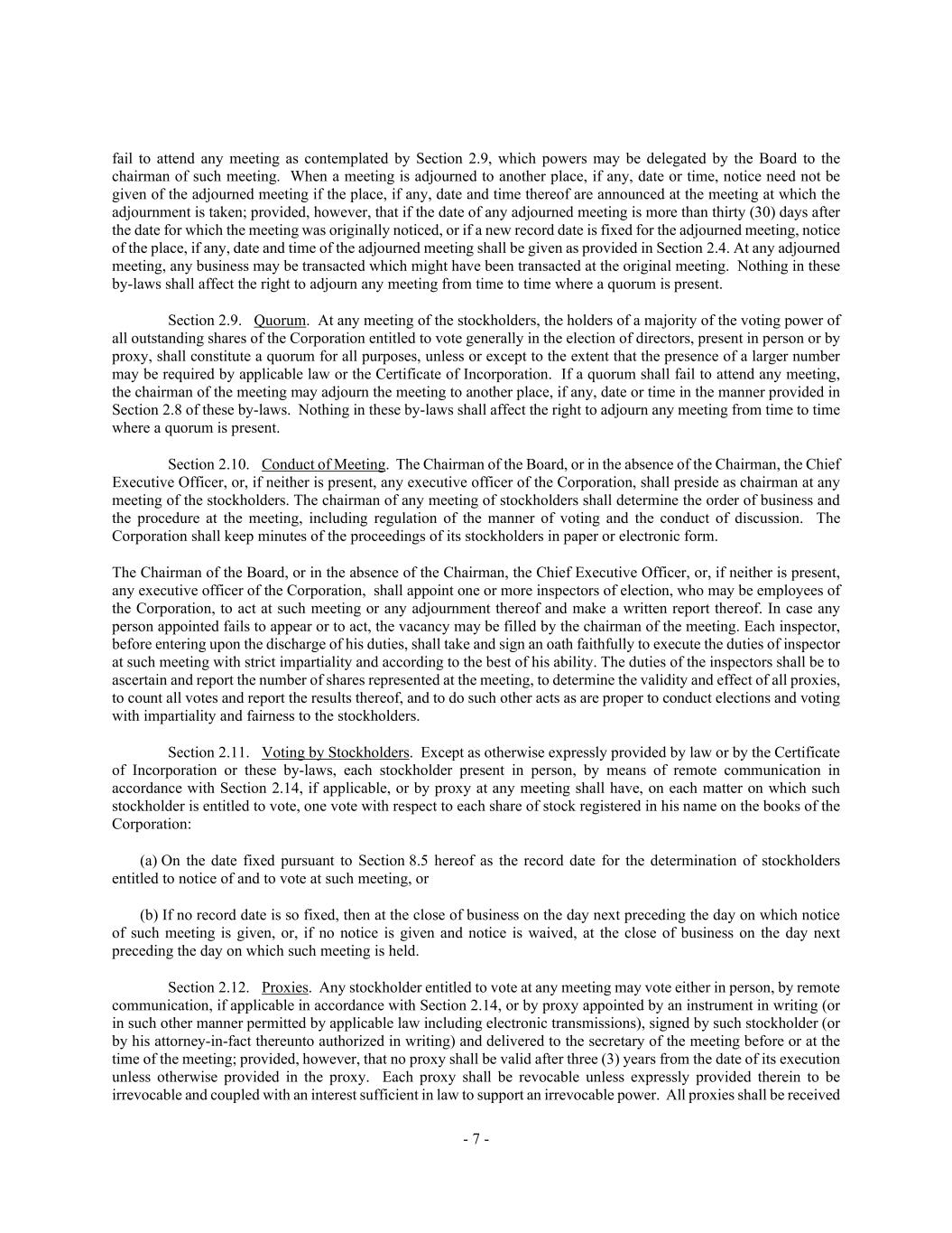 - 7 - fail to attend any meeting as contemplated by Section 2.9, which powers may be delegated by the Board to the chairman of such meeting. When a meeting is adjourned to another place, if any, date or time, notice need not be given of the adjourned meeting if the place, if any, date and time thereof are announced at the meeting at which the adjournment is taken; provided, however, that if the date of any adjourned meeting is more than thirty (30) days after the date for which the meeting was originally noticed, or if a new record date is fixed for the adjourned meeting, notice of the place, if any, date and time of the adjourned meeting shall be given as provided in Section 2.4. At any adjourned meeting, any business may be transacted which might have been transacted at the original meeting. Nothing in these by-laws shall affect the right to adjourn any meeting from time to time where a quorum is present. Section 2.9. Quorum. At any meeting of the stockholders, the holders of a majority of the voting power of all outstanding shares of the Corporation entitled to vote generally in the election of directors, present in person or by proxy, shall constitute a quorum for all purposes, unless or except to the extent that the presence of a larger number may be required by applicable law or the Certificate of Incorporation. If a quorum shall fail to attend any meeting, the chairman of the meeting may adjourn the meeting to another place, if any, date or time in the manner provided in Section 2.8 of these by-laws. Nothing in these by-laws shall affect the right to adjourn any meeting from time to time where a quorum is present. Section 2.10. Conduct of Meeting. The Chairman of the Board, or in the absence of the Chairman, the Chief Executive Officer, or, if neither is present, any executive officer of the Corporation, shall preside as chairman at any meeting of the stockholders. The chairman of any meeting of stockholders shall determine the order of business and the procedure at the meeting, including regulation of the manner of voting and the conduct of discussion. The Corporation shall keep minutes of the proceedings of its stockholders in paper or electronic form. The Chairman of the Board, or in the absence of the Chairman, the Chief Executive Officer, or, if neither is present, any executive officer of the Corporation, shall appoint one or more inspectors of election, who may be employees of the Corporation, to act at such meeting or any adjournment thereof and make a written report thereof. In case any person appointed fails to appear or to act, the vacancy may be filled by the chairman of the meeting. Each inspector, before entering upon the discharge of his duties, shall take and sign an oath faithfully to execute the duties of inspector at such meeting with strict impartiality and according to the best of his ability. The duties of the inspectors shall be to ascertain and report the number of shares represented at the meeting, to determine the validity and effect of all proxies, to count all votes and report the results thereof, and to do such other acts as are proper to conduct elections and voting with impartiality and fairness to the stockholders. Section 2.11. Voting by Stockholders. Except as otherwise expressly provided by law or by the Certificate of Incorporation or these by-laws, each stockholder present in person, by means of remote communication in accordance with Section 2.14, if applicable, or by proxy at any meeting shall have, on each matter on which such stockholder is entitled to vote, one vote with respect to each share of stock registered in his name on the books of the Corporation: (a) On the date fixed pursuant to Section 8.5 hereof as the record date for the determination of stockholders entitled to notice of and to vote at such meeting, or (b) If no record date is so fixed, then at the close of business on the day next preceding the day on which notice of such meeting is given, or, if no notice is given and notice is waived, at the close of business on the day next preceding the day on which such meeting is held. Section 2.12. Proxies. Any stockholder entitled to vote at any meeting may vote either in person, by remote communication, if applicable in accordance with Section 2.14, or by proxy appointed by an instrument in writing (or in such other manner permitted by applicable law including electronic transmissions), signed by such stockholder (or by his attorney-in-fact thereunto authorized in writing) and delivered to the secretary of the meeting before or at the time of the meeting; provided, however, that no proxy shall be valid after three (3) years from the date of its execution unless otherwise provided in the proxy. Each proxy shall be revocable unless expressly provided therein to be irrevocable and coupled with an interest sufficient in law to support an irrevocable power. All proxies shall be received