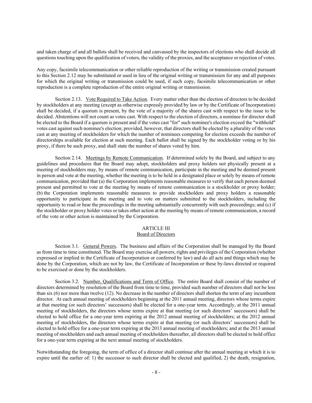 - 8 - and taken charge of and all ballots shall be received and canvassed by the inspectors of elections who shall decide all questions touching upon the qualification of voters, the validity of the proxies, and the acceptance or rejection of votes. Any copy, facsimile telecommunication or other reliable reproduction of the writing or transmission created pursuant to this Section 2.12 may be substituted or used in lieu of the original writing or transmission for any and all purposes for which the original writing or transmission could be used, if such copy, facsimile telecommunication or other reproduction is a complete reproduction of the entire original writing or transmission. Section 2.13. Vote Required to Take Action. Every matter other than the election of directors to be decided by stockholders at any meeting (except as otherwise expressly provided by law or by the Certificate of Incorporation) shall be decided, if a quorum is present, by the vote of a majority of the shares cast with respect to the issue to be decided. Abstentions will not count as votes cast. With respect to the election of directors, a nominee for director shall be elected to the Board if a quorum is present and if the votes cast "for" such nominee's election exceed the "withhold" votes cast against such nominee's election; provided, however, that directors shall be elected by a plurality of the votes cast at any meeting of stockholders for which the number of nominees competing for election exceeds the number of directorships available for election at such meeting. Each ballot shall be signed by the stockholder voting or by his proxy, if there be such proxy, and shall state the number of shares voted by him. Section 2.14. Meetings by Remote Communication. If determined solely by the Board, and subject to any guidelines and procedures that the Board may adopt, stockholders and proxy holders not physically present at a meeting of stockholders may, by means of remote communication, participate in the meeting and be deemed present in person and vote at the meeting, whether the meeting is to be held in a designated place or solely by means of remote communication, provided that (a) the Corporation implements reasonable measures to verify that each person deemed present and permitted to vote at the meeting by means of remote communication is a stockholder or proxy holder; (b) the Corporation implements reasonable measures to provide stockholders and proxy holders a reasonable opportunity to participate in the meeting and to vote on matters submitted to the stockholders, including the opportunity to read or hear the proceedings in the meeting substantially concurrently with such proceedings; and (c) if the stockholder or proxy holder votes or takes other action at the meeting by means of remote communication, a record of the vote or other action is maintained by the Corporation. ARTICLE III Board of Directors Section 3.1. General Powers. The business and affairs of the Corporation shall be managed by the Board as from time to time constituted. The Board may exercise all powers, rights and privileges of the Corporation (whether expressed or implied in the Certificate of Incorporation or conferred by law) and do all acts and things which may be done by the Corporation, which are not by law, the Certificate of Incorporation or these by-laws directed or required to be exercised or done by the stockholders. Section 3.2. Number, Qualifications and Term of Office. The entire Board shall consist of the number of directors determined by resolution of the Board from time to time, provided such number of directors shall not be less than six (6) nor more than twelve (12). No decrease in the number of directors shall shorten the term of any incumbent director. At each annual meeting of stockholders beginning at the 2011 annual meeting, directors whose terms expire at that meeting (or such directors’ successors) shall be elected for a one-year term. Accordingly, at the 2011 annual meeting of stockholders, the directors whose terms expire at that meeting (or such directors’ successors) shall be elected to hold office for a one-year term expiring at the 2012 annual meeting of stockholders; at the 2012 annual meeting of stockholders, the directors whose terms expire at that meeting (or such directors’ successors) shall be elected to hold office for a one-year term expiring at the 2013 annual meeting of stockholders; and at the 2013 annual meeting of stockholders and each annual meeting of stockholders thereafter, all directors shall be elected to hold office for a one-year term expiring at the next annual meeting of stockholders. Notwithstanding the foregoing, the term of office of a director shall continue after the annual meeting at which it is to expire until the earlier of: 1) the successor to such director shall be elected and qualified, 2) the death, resignation,