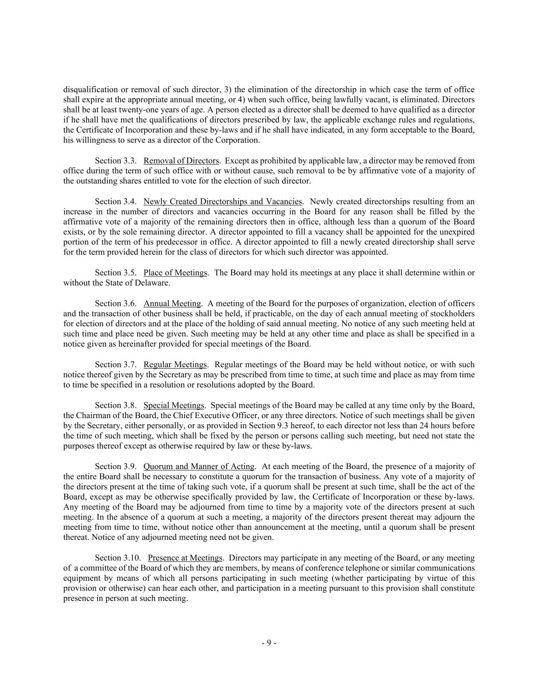 - 9 - disqualification or removal of such director, 3) the elimination of the directorship in which case the term of office shall expire at the appropriate annual meeting, or 4) when such office, being lawfully vacant, is eliminated. Directors shall be at least twenty-one years of age. A person elected as a director shall be deemed to have qualified as a director if he shall have met the qualifications of directors prescribed by law, the applicable exchange rules and regulations, the Certificate of Incorporation and these by-laws and if he shall have indicated, in any form acceptable to the Board, his willingness to serve as a director of the Corporation. Section 3.3. Removal of Directors. Except as prohibited by applicable law, a director may be removed from office during the term of such office with or without cause, such removal to be by affirmative vote of a majority of the outstanding shares entitled to vote for the election of such director. Section 3.4. Newly Created Directorships and Vacancies. Newly created directorships resulting from an increase in the number of directors and vacancies occurring in the Board for any reason shall be filled by the affirmative vote of a majority of the remaining directors then in office, although less than a quorum of the Board exists, or by the sole remaining director. A director appointed to fill a vacancy shall be appointed for the unexpired portion of the term of his predecessor in office. A director appointed to fill a newly created directorship shall serve for the term provided herein for the class of directors for which such director was appointed. Section 3.5. Place of Meetings. The Board may hold its meetings at any place it shall determine within or without the State of Delaware. Section 3.6. Annual Meeting. A meeting of the Board for the purposes of organization, election of officers and the transaction of other business shall be held, if practicable, on the day of each annual meeting of stockholders for election of directors and at the place of the holding of said annual meeting. No notice of any such meeting held at such time and place need be given. Such meeting may be held at any other time and place as shall be specified in a notice given as hereinafter provided for special meetings of the Board. Section 3.7. Regular Meetings. Regular meetings of the Board may be held without notice, or with such notice thereof given by the Secretary as may be prescribed from time to time, at such time and place as may from time to time be specified in a resolution or resolutions adopted by the Board. Section 3.8. Special Meetings. Special meetings of the Board may be called at any time only by the Board, the Chairman of the Board, the Chief Executive Officer, or any three directors. Notice of such meetings shall be given by the Secretary, either personally, or as provided in Section 9.3 hereof, to each director not less than 24 hours before the time of such meeting, which shall be fixed by the person or persons calling such meeting, but need not state the purposes thereof except as otherwise required by law or these by-laws. Section 3.9. Quorum and Manner of Acting. At each meeting of the Board, the presence of a majority of the entire Board shall be necessary to constitute a quorum for the transaction of business. Any vote of a majority of the directors present at the time of taking such vote, if a quorum shall be present at such time, shall be the act of the Board, except as may be otherwise specifically provided by law, the Certificate of Incorporation or these by-laws. Any meeting of the Board may be adjourned from time to time by a majority vote of the directors present at such meeting. In the absence of a quorum at such a meeting, a majority of the directors present thereat may adjourn the meeting from time to time, without notice other than announcement at the meeting, until a quorum shall be present thereat. Notice of any adjourned meeting need not be given. Section 3.10. Presence at Meetings. Directors may participate in any meeting of the Board, or any meeting of a committee of the Board of which they are members, by means of conference telephone or similar communications equipment by means of which all persons participating in such meeting (whether participating by virtue of this provision or otherwise) can hear each other, and participation in a meeting pursuant to this provision shall constitute presence in person at such meeting.