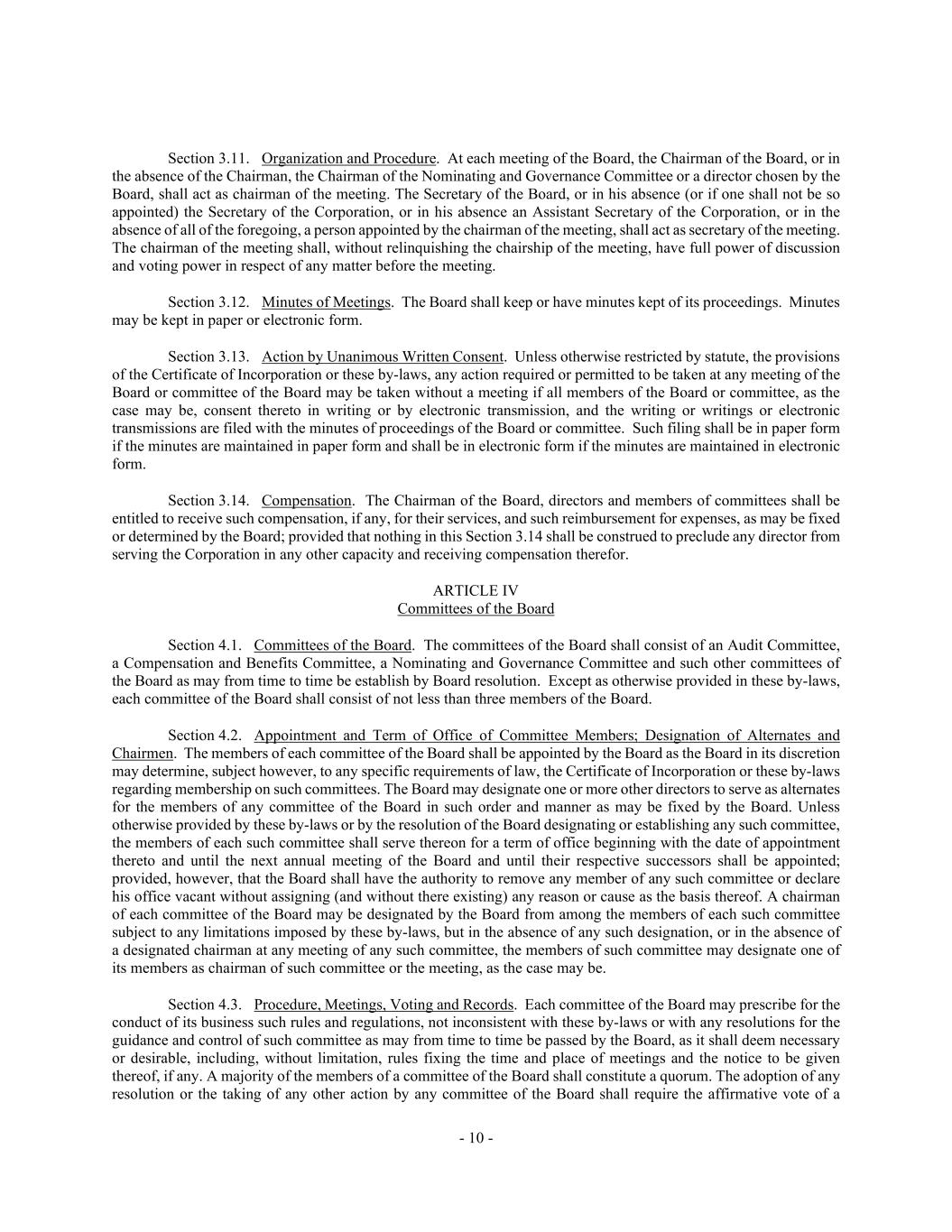 - 10 - Section 3.11. Organization and Procedure. At each meeting of the Board, the Chairman of the Board, or in the absence of the Chairman, the Chairman of the Nominating and Governance Committee or a director chosen by the Board, shall act as chairman of the meeting. The Secretary of the Board, or in his absence (or if one shall not be so appointed) the Secretary of the Corporation, or in his absence an Assistant Secretary of the Corporation, or in the absence of all of the foregoing, a person appointed by the chairman of the meeting, shall act as secretary of the meeting. The chairman of the meeting shall, without relinquishing the chairship of the meeting, have full power of discussion and voting power in respect of any matter before the meeting. Section 3.12. Minutes of Meetings. The Board shall keep or have minutes kept of its proceedings. Minutes may be kept in paper or electronic form. Section 3.13. Action by Unanimous Written Consent. Unless otherwise restricted by statute, the provisions of the Certificate of Incorporation or these by-laws, any action required or permitted to be taken at any meeting of the Board or committee of the Board may be taken without a meeting if all members of the Board or committee, as the case may be, consent thereto in writing or by electronic transmission, and the writing or writings or electronic transmissions are filed with the minutes of proceedings of the Board or committee. Such filing shall be in paper form if the minutes are maintained in paper form and shall be in electronic form if the minutes are maintained in electronic form. Section 3.14. Compensation. The Chairman of the Board, directors and members of committees shall be entitled to receive such compensation, if any, for their services, and such reimbursement for expenses, as may be fixed or determined by the Board; provided that nothing in this Section 3.14 shall be construed to preclude any director from serving the Corporation in any other capacity and receiving compensation therefor. ARTICLE IV Committees of the Board Section 4.1. Committees of the Board. The committees of the Board shall consist of an Audit Committee, a Compensation and Benefits Committee, a Nominating and Governance Committee and such other committees of the Board as may from time to time be establish by Board resolution. Except as otherwise provided in these by-laws, each committee of the Board shall consist of not less than three members of the Board. Section 4.2. Appointment and Term of Office of Committee Members; Designation of Alternates and Chairmen. The members of each committee of the Board shall be appointed by the Board as the Board in its discretion may determine, subject however, to any specific requirements of law, the Certificate of Incorporation or these by-laws regarding membership on such committees. The Board may designate one or more other directors to serve as alternates for the members of any committee of the Board in such order and manner as may be fixed by the Board. Unless otherwise provided by these by-laws or by the resolution of the Board designating or establishing any such committee, the members of each such committee shall serve thereon for a term of office beginning with the date of appointment thereto and until the next annual meeting of the Board and until their respective successors shall be appointed; provided, however, that the Board shall have the authority to remove any member of any such committee or declare his office vacant without assigning (and without there existing) any reason or cause as the basis thereof. A chairman of each committee of the Board may be designated by the Board from among the members of each such committee subject to any limitations imposed by these by-laws, but in the absence of any such designation, or in the absence of a designated chairman at any meeting of any such committee, the members of such committee may designate one of its members as chairman of such committee or the meeting, as the case may be. Section 4.3. Procedure, Meetings, Voting and Records. Each committee of the Board may prescribe for the conduct of its business such rules and regulations, not inconsistent with these by-laws or with any resolutions for the guidance and control of such committee as may from time to time be passed by the Board, as it shall deem necessary or desirable, including, without limitation, rules fixing the time and place of meetings and the notice to be given thereof, if any. A majority of the members of a committee of the Board shall constitute a quorum. The adoption of any resolution or the taking of any other action by any committee of the Board shall require the affirmative vote of a