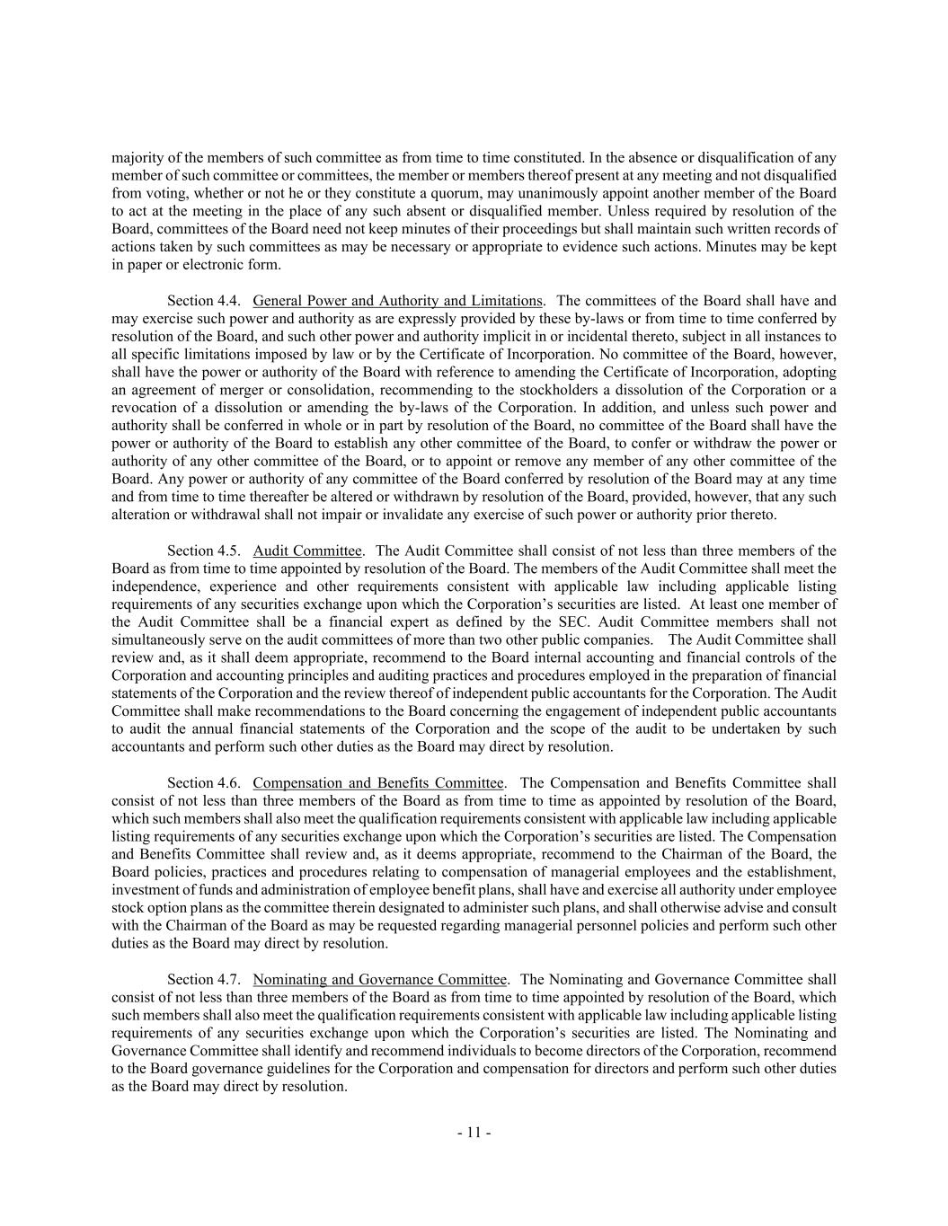 - 11 - majority of the members of such committee as from time to time constituted. In the absence or disqualification of any member of such committee or committees, the member or members thereof present at any meeting and not disqualified from voting, whether or not he or they constitute a quorum, may unanimously appoint another member of the Board to act at the meeting in the place of any such absent or disqualified member. Unless required by resolution of the Board, committees of the Board need not keep minutes of their proceedings but shall maintain such written records of actions taken by such committees as may be necessary or appropriate to evidence such actions. Minutes may be kept in paper or electronic form. Section 4.4. General Power and Authority and Limitations. The committees of the Board shall have and may exercise such power and authority as are expressly provided by these by-laws or from time to time conferred by resolution of the Board, and such other power and authority implicit in or incidental thereto, subject in all instances to all specific limitations imposed by law or by the Certificate of Incorporation. No committee of the Board, however, shall have the power or authority of the Board with reference to amending the Certificate of Incorporation, adopting an agreement of merger or consolidation, recommending to the stockholders a dissolution of the Corporation or a revocation of a dissolution or amending the by-laws of the Corporation. In addition, and unless such power and authority shall be conferred in whole or in part by resolution of the Board, no committee of the Board shall have the power or authority of the Board to establish any other committee of the Board, to confer or withdraw the power or authority of any other committee of the Board, or to appoint or remove any member of any other committee of the Board. Any power or authority of any committee of the Board conferred by resolution of the Board may at any time and from time to time thereafter be altered or withdrawn by resolution of the Board, provided, however, that any such alteration or withdrawal shall not impair or invalidate any exercise of such power or authority prior thereto. Section 4.5. Audit Committee. The Audit Committee shall consist of not less than three members of the Board as from time to time appointed by resolution of the Board. The members of the Audit Committee shall meet the independence, experience and other requirements consistent with applicable law including applicable listing requirements of any securities exchange upon which the Corporation’s securities are listed. At least one member of the Audit Committee shall be a financial expert as defined by the SEC. Audit Committee members shall not simultaneously serve on the audit committees of more than two other public companies. The Audit Committee shall review and, as it shall deem appropriate, recommend to the Board internal accounting and financial controls of the Corporation and accounting principles and auditing practices and procedures employed in the preparation of financial statements of the Corporation and the review thereof of independent public accountants for the Corporation. The Audit Committee shall make recommendations to the Board concerning the engagement of independent public accountants to audit the annual financial statements of the Corporation and the scope of the audit to be undertaken by such accountants and perform such other duties as the Board may direct by resolution. Section 4.6. Compensation and Benefits Committee. The Compensation and Benefits Committee shall consist of not less than three members of the Board as from time to time as appointed by resolution of the Board, which such members shall also meet the qualification requirements consistent with applicable law including applicable listing requirements of any securities exchange upon which the Corporation’s securities are listed. The Compensation and Benefits Committee shall review and, as it deems appropriate, recommend to the Chairman of the Board, the Board policies, practices and procedures relating to compensation of managerial employees and the establishment, investment of funds and administration of employee benefit plans, shall have and exercise all authority under employee stock option plans as the committee therein designated to administer such plans, and shall otherwise advise and consult with the Chairman of the Board as may be requested regarding managerial personnel policies and perform such other duties as the Board may direct by resolution. Section 4.7. Nominating and Governance Committee. The Nominating and Governance Committee shall consist of not less than three members of the Board as from time to time appointed by resolution of the Board, which such members shall also meet the qualification requirements consistent with applicable law including applicable listing requirements of any securities exchange upon which the Corporation’s securities are listed. The Nominating and Governance Committee shall identify and recommend individuals to become directors of the Corporation, recommend to the Board governance guidelines for the Corporation and compensation for directors and perform such other duties as the Board may direct by resolution.