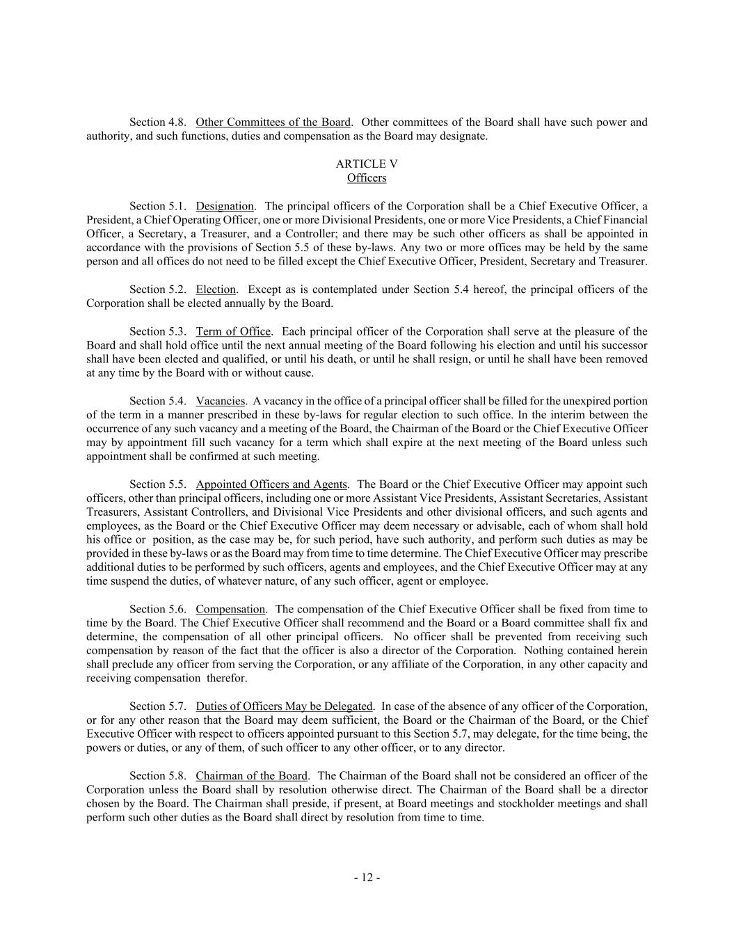 - 12 - Section 4.8. Other Committees of the Board. Other committees of the Board shall have such power and authority, and such functions, duties and compensation as the Board may designate. ARTICLE V Officers Section 5.1. Designation. The principal officers of the Corporation shall be a Chief Executive Officer, a President, a Chief Operating Officer, one or more Divisional Presidents, one or more Vice Presidents, a Chief Financial Officer, a Secretary, a Treasurer, and a Controller; and there may be such other officers as shall be appointed in accordance with the provisions of Section 5.5 of these by-laws. Any two or more offices may be held by the same person and all offices do not need to be filled except the Chief Executive Officer, President, Secretary and Treasurer. Section 5.2. Election. Except as is contemplated under Section 5.4 hereof, the principal officers of the Corporation shall be elected annually by the Board. Section 5.3. Term of Office. Each principal officer of the Corporation shall serve at the pleasure of the Board and shall hold office until the next annual meeting of the Board following his election and until his successor shall have been elected and qualified, or until his death, or until he shall resign, or until he shall have been removed at any time by the Board with or without cause. Section 5.4. Vacancies. A vacancy in the office of a principal officer shall be filled for the unexpired portion of the term in a manner prescribed in these by-laws for regular election to such office. In the interim between the occurrence of any such vacancy and a meeting of the Board, the Chairman of the Board or the Chief Executive Officer may by appointment fill such vacancy for a term which shall expire at the next meeting of the Board unless such appointment shall be confirmed at such meeting. Section 5.5. Appointed Officers and Agents. The Board or the Chief Executive Officer may appoint such officers, other than principal officers, including one or more Assistant Vice Presidents, Assistant Secretaries, Assistant Treasurers, Assistant Controllers, and Divisional Vice Presidents and other divisional officers, and such agents and employees, as the Board or the Chief Executive Officer may deem necessary or advisable, each of whom shall hold his office or position, as the case may be, for such period, have such authority, and perform such duties as may be provided in these by-laws or as the Board may from time to time determine. The Chief Executive Officer may prescribe additional duties to be performed by such officers, agents and employees, and the Chief Executive Officer may at any time suspend the duties, of whatever nature, of any such officer, agent or employee. Section 5.6. Compensation. The compensation of the Chief Executive Officer shall be fixed from time to time by the Board. The Chief Executive Officer shall recommend and the Board or a Board committee shall fix and determine, the compensation of all other principal officers. No officer shall be prevented from receiving such compensation by reason of the fact that the officer is also a director of the Corporation. Nothing contained herein shall preclude any officer from serving the Corporation, or any affiliate of the Corporation, in any other capacity and receiving compensation therefor. Section 5.7. Duties of Officers May be Delegated. In case of the absence of any officer of the Corporation, or for any other reason that the Board may deem sufficient, the Board or the Chairman of the Board, or the Chief Executive Officer with respect to officers appointed pursuant to this Section 5.7, may delegate, for the time being, the powers or duties, or any of them, of such officer to any other officer, or to any director. Section 5.8. Chairman of the Board. The Chairman of the Board shall not be considered an officer of the Corporation unless the Board shall by resolution otherwise direct. The Chairman of the Board shall be a director chosen by the Board. The Chairman shall preside, if present, at Board meetings and stockholder meetings and shall perform such other duties as the Board shall direct by resolution from time to time.