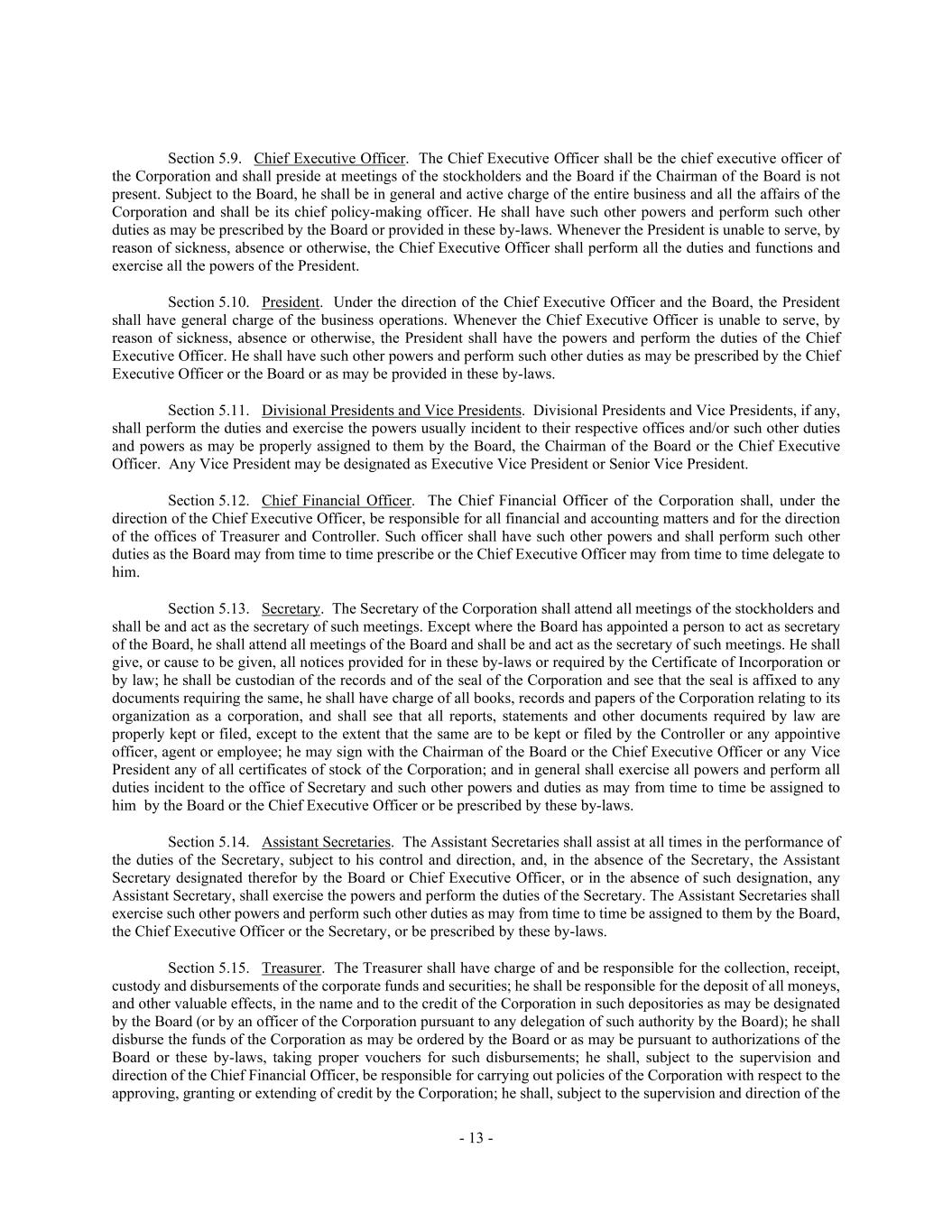 - 13 - Section 5.9. Chief Executive Officer. The Chief Executive Officer shall be the chief executive officer of the Corporation and shall preside at meetings of the stockholders and the Board if the Chairman of the Board is not present. Subject to the Board, he shall be in general and active charge of the entire business and all the affairs of the Corporation and shall be its chief policy-making officer. He shall have such other powers and perform such other duties as may be prescribed by the Board or provided in these by-laws. Whenever the President is unable to serve, by reason of sickness, absence or otherwise, the Chief Executive Officer shall perform all the duties and functions and exercise all the powers of the President. Section 5.10. President. Under the direction of the Chief Executive Officer and the Board, the President shall have general charge of the business operations. Whenever the Chief Executive Officer is unable to serve, by reason of sickness, absence or otherwise, the President shall have the powers and perform the duties of the Chief Executive Officer. He shall have such other powers and perform such other duties as may be prescribed by the Chief Executive Officer or the Board or as may be provided in these by-laws. Section 5.11. Divisional Presidents and Vice Presidents. Divisional Presidents and Vice Presidents, if any, shall perform the duties and exercise the powers usually incident to their respective offices and/or such other duties and powers as may be properly assigned to them by the Board, the Chairman of the Board or the Chief Executive Officer. Any Vice President may be designated as Executive Vice President or Senior Vice President. Section 5.12. Chief Financial Officer. The Chief Financial Officer of the Corporation shall, under the direction of the Chief Executive Officer, be responsible for all financial and accounting matters and for the direction of the offices of Treasurer and Controller. Such officer shall have such other powers and shall perform such other duties as the Board may from time to time prescribe or the Chief Executive Officer may from time to time delegate to him. Section 5.13. Secretary. The Secretary of the Corporation shall attend all meetings of the stockholders and shall be and act as the secretary of such meetings. Except where the Board has appointed a person to act as secretary of the Board, he shall attend all meetings of the Board and shall be and act as the secretary of such meetings. He shall give, or cause to be given, all notices provided for in these by-laws or required by the Certificate of Incorporation or by law; he shall be custodian of the records and of the seal of the Corporation and see that the seal is affixed to any documents requiring the same, he shall have charge of all books, records and papers of the Corporation relating to its organization as a corporation, and shall see that all reports, statements and other documents required by law are properly kept or filed, except to the extent that the same are to be kept or filed by the Controller or any appointive officer, agent or employee; he may sign with the Chairman of the Board or the Chief Executive Officer or any Vice President any of all certificates of stock of the Corporation; and in general shall exercise all powers and perform all duties incident to the office of Secretary and such other powers and duties as may from time to time be assigned to him by the Board or the Chief Executive Officer or be prescribed by these by-laws. Section 5.14. Assistant Secretaries. The Assistant Secretaries shall assist at all times in the performance of the duties of the Secretary, subject to his control and direction, and, in the absence of the Secretary, the Assistant Secretary designated therefor by the Board or Chief Executive Officer, or in the absence of such designation, any Assistant Secretary, shall exercise the powers and perform the duties of the Secretary. The Assistant Secretaries shall exercise such other powers and perform such other duties as may from time to time be assigned to them by the Board, the Chief Executive Officer or the Secretary, or be prescribed by these by-laws. Section 5.15. Treasurer. The Treasurer shall have charge of and be responsible for the collection, receipt, custody and disbursements of the corporate funds and securities; he shall be responsible for the deposit of all moneys, and other valuable effects, in the name and to the credit of the Corporation in such depositories as may be designated by the Board (or by an officer of the Corporation pursuant to any delegation of such authority by the Board); he shall disburse the funds of the Corporation as may be ordered by the Board or as may be pursuant to authorizations of the Board or these by-laws, taking proper vouchers for such disbursements; he shall, subject to the supervision and direction of the Chief Financial Officer, be responsible for carrying out policies of the Corporation with respect to the approving, granting or extending of credit by the Corporation; he shall, subject to the supervision and direction of the