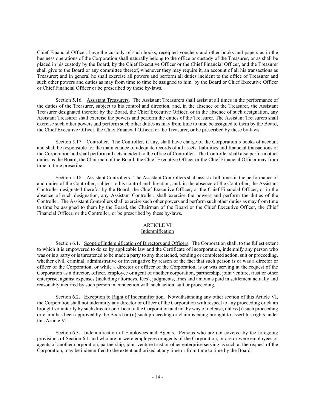 - 14 - Chief Financial Officer, have the custody of such books, receipted vouchers and other books and papers as in the business operations of the Corporation shall naturally belong to the office or custody of the Treasurer, or as shall be placed in his custody by the Board, by the Chief Executive Officer or the Chief Financial Officer, and the Treasurer shall give to the Board or any committee thereof, whenever they may require it, an account of all his transactions as Treasurer; and in general he shall exercise all powers and perform all duties incident to the office of Treasurer and such other powers and duties as may from time to time be assigned to him by the Board or Chief Executive Officer or Chief Financial Officer or be prescribed by these by-laws. Section 5.16. Assistant Treasurers. The Assistant Treasurers shall assist at all times in the performance of the duties of the Treasurer, subject to his control and direction, and, in the absence of the Treasurer, the Assistant Treasurer designated therefor by the Board, the Chief Executive Officer, or in the absence of such designation, any Assistant Treasurer shall exercise the powers and perform the duties of the Treasurer. The Assistant Treasurers shall exercise such other powers and perform such other duties as may from time to time be assigned to them by the Board, the Chief Executive Officer, the Chief Financial Officer, or the Treasurer, or be prescribed by these by-laws. Section 5.17. Controller. The Controller, if any, shall have charge of the Corporation’s books of account and shall be responsible for the maintenance of adequate records of all assets, liabilities and financial transactions of the Corporation and shall perform all acts incident to the office of Controller. The Controller shall also perform other duties as the Board, the Chairman of the Board, the Chief Executive Officer or the Chief Financial Officer may from time to time prescribe. Section 5.18. Assistant Controllers. The Assistant Controllers shall assist at all times in the performance of and duties of the Controller, subject to his control and direction, and, in the absence of the Controller, the Assistant Controller designated therefor by the Board, the Chief Executive Officer, or the Chief Financial Officer, or in the absence of such designation, any Assistant Controller, shall exercise the powers and perform the duties of the Controller. The Assistant Controllers shall exercise such other powers and perform such other duties as may from time to time be assigned to them by the Board, the Chairman of the Board or the Chief Executive Officer, the Chief Financial Officer, or the Controller, or be prescribed by these by-laws. ARTICLE VI Indemnification Section 6.1. Scope of Indemnification of Directors and Officers. The Corporation shall, to the fullest extent to which it is empowered to do so by applicable law and the Certificate of Incorporation, indemnify any person who was or is a party or is threatened to be made a party to any threatened, pending or completed action, suit or proceeding, whether civil, criminal, administrative or investigative by reason of the fact that such person is or was a director or officer of the Corporation, or while a director or officer of the Corporation, is or was serving at the request of the Corporation as a director, officer, employee or agent of another corporation, partnership, joint venture, trust or other enterprise, against expenses (including attorneys, fees), judgments, fines and amounts paid in settlement actually and reasonably incurred by such person in connection with such action, suit or proceeding. Section 6.2. Exception to Right of Indemnification. Notwithstanding any other section of this Article VI, the Corporation shall not indemnify any director or officer of the Corporation with respect to any proceeding or claim brought voluntarily by such director or officer of the Corporation and not by way of defense, unless (i) such proceeding or claim has been approved by the Board or (ii) such proceeding or claim is being brought to assert his rights under this Article VI. Section 6.3. Indemnification of Employees and Agents. Persons who are not covered by the foregoing provisions of Section 6.1 and who are or were employees or agents of the Corporation, or are or were employees or agents of another corporation, partnership, joint venture trust or other enterprise serving as such at the request of the Corporation, may be indemnified to the extent authorized at any time or from time to time by the Board.