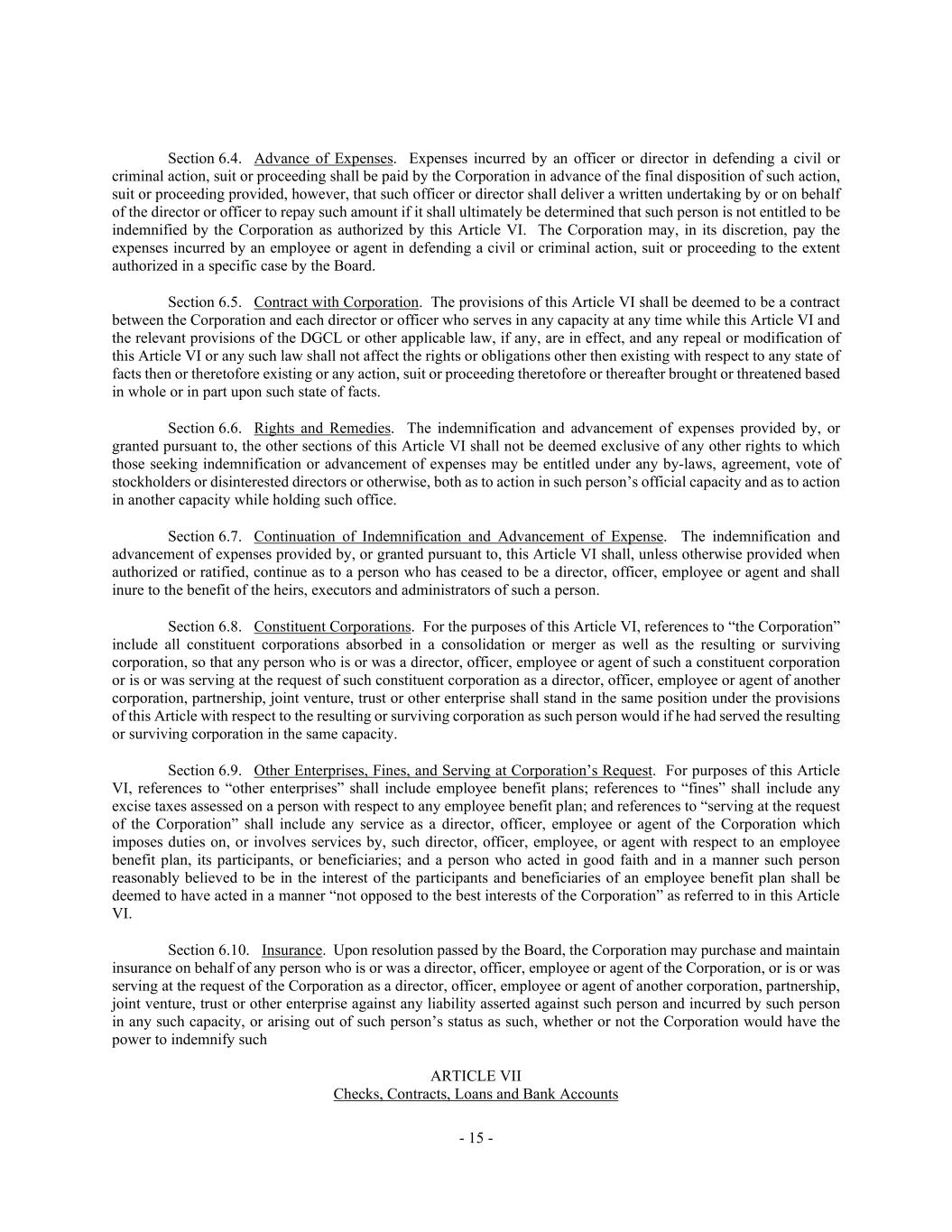 - 15 - Section 6.4. Advance of Expenses. Expenses incurred by an officer or director in defending a civil or criminal action, suit or proceeding shall be paid by the Corporation in advance of the final disposition of such action, suit or proceeding provided, however, that such officer or director shall deliver a written undertaking by or on behalf of the director or officer to repay such amount if it shall ultimately be determined that such person is not entitled to be indemnified by the Corporation as authorized by this Article VI. The Corporation may, in its discretion, pay the expenses incurred by an employee or agent in defending a civil or criminal action, suit or proceeding to the extent authorized in a specific case by the Board. Section 6.5. Contract with Corporation. The provisions of this Article VI shall be deemed to be a contract between the Corporation and each director or officer who serves in any capacity at any time while this Article VI and the relevant provisions of the DGCL or other applicable law, if any, are in effect, and any repeal or modification of this Article VI or any such law shall not affect the rights or obligations other then existing with respect to any state of facts then or theretofore existing or any action, suit or proceeding theretofore or thereafter brought or threatened based in whole or in part upon such state of facts. Section 6.6. Rights and Remedies. The indemnification and advancement of expenses provided by, or granted pursuant to, the other sections of this Article VI shall not be deemed exclusive of any other rights to which those seeking indemnification or advancement of expenses may be entitled under any by-laws, agreement, vote of stockholders or disinterested directors or otherwise, both as to action in such person’s official capacity and as to action in another capacity while holding such office. Section 6.7. Continuation of Indemnification and Advancement of Expense. The indemnification and advancement of expenses provided by, or granted pursuant to, this Article VI shall, unless otherwise provided when authorized or ratified, continue as to a person who has ceased to be a director, officer, employee or agent and shall inure to the benefit of the heirs, executors and administrators of such a person. Section 6.8. Constituent Corporations. For the purposes of this Article VI, references to “the Corporation” include all constituent corporations absorbed in a consolidation or merger as well as the resulting or surviving corporation, so that any person who is or was a director, officer, employee or agent of such a constituent corporation or is or was serving at the request of such constituent corporation as a director, officer, employee or agent of another corporation, partnership, joint venture, trust or other enterprise shall stand in the same position under the provisions of this Article with respect to the resulting or surviving corporation as such person would if he had served the resulting or surviving corporation in the same capacity. Section 6.9. Other Enterprises, Fines, and Serving at Corporation’s Request. For purposes of this Article VI, references to “other enterprises” shall include employee benefit plans; references to “fines” shall include any excise taxes assessed on a person with respect to any employee benefit plan; and references to “serving at the request of the Corporation” shall include any service as a director, officer, employee or agent of the Corporation which imposes duties on, or involves services by, such director, officer, employee, or agent with respect to an employee benefit plan, its participants, or beneficiaries; and a person who acted in good faith and in a manner such person reasonably believed to be in the interest of the participants and beneficiaries of an employee benefit plan shall be deemed to have acted in a manner “not opposed to the best interests of the Corporation” as referred to in this Article VI. Section 6.10. Insurance. Upon resolution passed by the Board, the Corporation may purchase and maintain insurance on behalf of any person who is or was a director, officer, employee or agent of the Corporation, or is or was serving at the request of the Corporation as a director, officer, employee or agent of another corporation, partnership, joint venture, trust or other enterprise against any liability asserted against such person and incurred by such person in any such capacity, or arising out of such person’s status as such, whether or not the Corporation would have the power to indemnify such ARTICLE VII Checks, Contracts, Loans and Bank Accounts