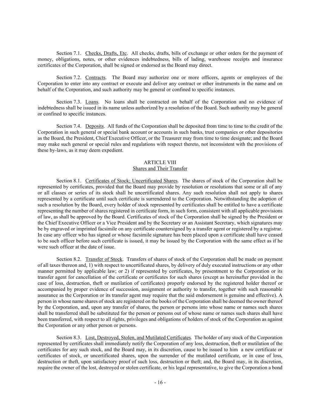 - 16 - Section 7.1. Checks, Drafts, Etc. All checks, drafts, bills of exchange or other orders for the payment of money, obligations, notes, or other evidences indebtedness, bills of lading, warehouse receipts and insurance certificates of the Corporation, shall be signed or endorsed as the Board may direct. Section 7.2. Contracts. The Board may authorize one or more officers, agents or employees of the Corporation to enter into any contract or execute and deliver any contract or other instruments in the name and on behalf of the Corporation, and such authority may be general or confined to specific instances. Section 7.3. Loans. No loans shall be contracted on behalf of the Corporation and no evidence of indebtedness shall be issued in its name unless authorized by a resolution of the Board. Such authority may be general or confined to specific instances. Section 7.4. Deposits. All funds of the Corporation shall be deposited from time to time to the credit of the Corporation in such general or special bank account or accounts in such banks, trust companies or other depositories as the Board, the President, Chief Executive Officer, or the Treasurer may from time to time designate; and the Board may make such general or special rules and regulations with respect thereto, not inconsistent with the provisions of these by-laws, as it may deem expedient. ARTICLE VIII Shares and Their Transfer Section 8.1. Certificates of Stock; Uncertificated Shares. The shares of stock of the Corporation shall be represented by certificates, provided that the Board may provide by resolution or resolutions that some or all of any or all classes or series of its stock shall be uncertificated shares. Any such resolution shall not apply to shares represented by a certificate until such certificate is surrendered to the Corporation. Notwithstanding the adoption of such a resolution by the Board, every holder of stock represented by certificates shall be entitled to have a certificate representing the number of shares registered in certificate form, in such form, consistent with all applicable provisions of law, as shall be approved by the Board. Certificates of stock of the Corporation shall be signed by the President or the Chief Executive Officer or a Vice President and by the Secretary or an Assistant Secretary, which signatures may be by engraved or imprinted facsimile on any certificate countersigned by a transfer agent or registered by a registrar. In case any officer who has signed or whose facsimile signature has been placed upon a certificate shall have ceased to be such officer before such certificate is issued, it may be issued by the Corporation with the same effect as if he were such officer at the date of issue. Section 8.2. Transfer of Stock. Transfers of shares of stock of the Corporation shall be made on payment of all taxes thereon and, 1) with respect to uncertificated shares, by delivery of duly executed instructions or any other manner permitted by applicable law; or 2) if represented by certificates, by presentment to the Corporation or its transfer agent for cancellation of the certificate or certificates for such shares (except as hereinafter provided in the case of loss, destruction, theft or mutilation of certificates) properly endorsed by the registered holder thereof or accompanied by proper evidence of succession, assignment or authority to transfer, together with such reasonable assurance as the Corporation or its transfer agent may require that the said endorsement is genuine and effective). A person in whose name shares of stock are registered on the books of the Corporation shall be deemed the owner thereof by the Corporation, and, upon any transfer of shares, the person or persons into whose name or names such shares shall be transferred shall be substituted for the person or persons out of whose name or names such shares shall have been transferred, with respect to all rights, privileges and obligations of holders of stock of the Corporation as against the Corporation or any other person or persons. Section 8.3. Lost, Destroyed, Stolen, and Mutilated Certificates. The holder of any stock of the Corporation represented by certificates shall immediately notify the Corporation of any loss, destruction, theft or mutilation of the certificates for any such stock, and the Board may, in its discretion, cause to be issued to him a new certificate or certificates of stock, or uncertificated shares, upon the surrender of the mutilated certificate, or in case of loss, destruction or theft, upon satisfactory proof of such loss, destruction or theft; and, the Board may, in its discretion, require the owner of the lost, destroyed or stolen certificate, or his legal representative, to give the Corporation a bond