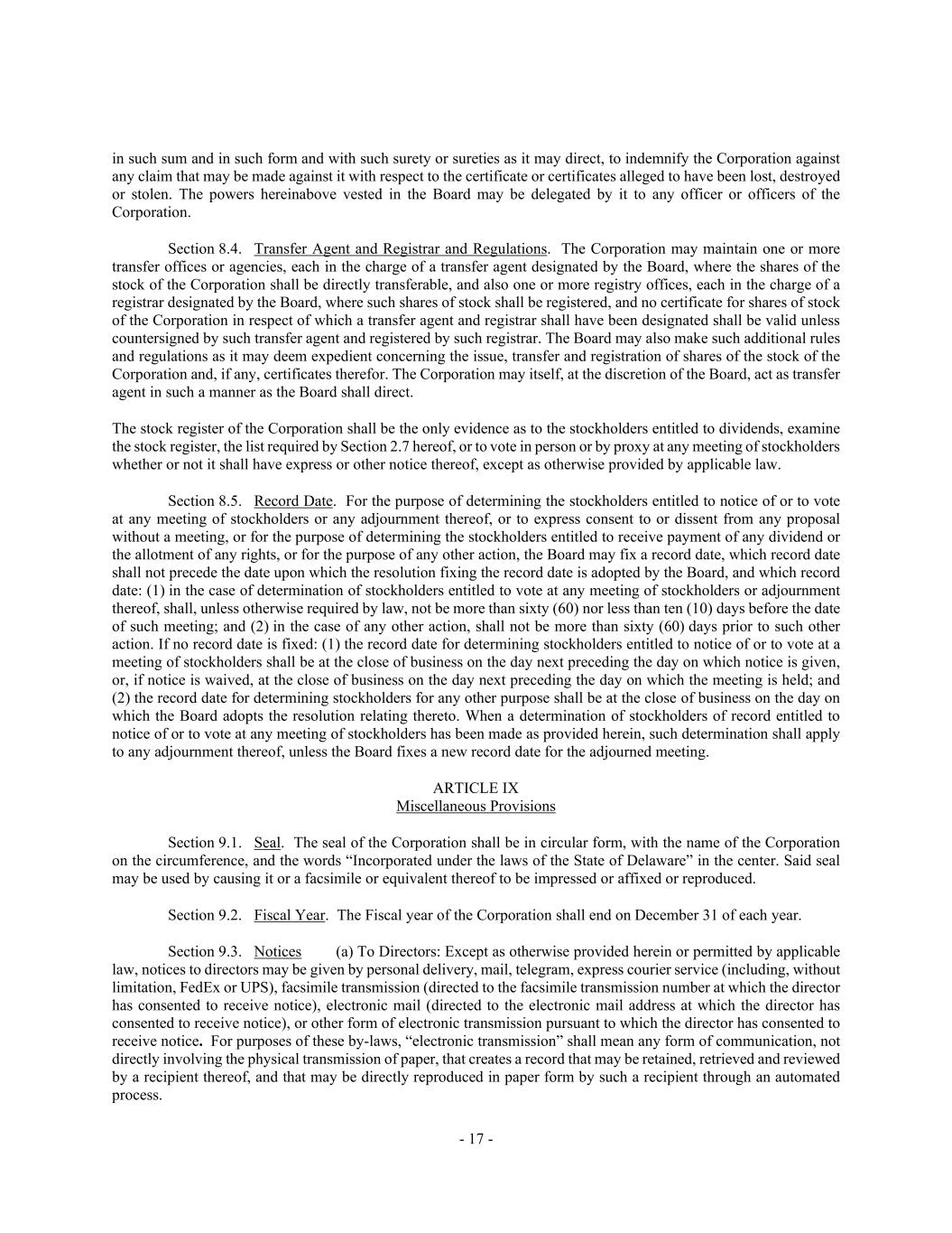 - 17 - in such sum and in such form and with such surety or sureties as it may direct, to indemnify the Corporation against any claim that may be made against it with respect to the certificate or certificates alleged to have been lost, destroyed or stolen. The powers hereinabove vested in the Board may be delegated by it to any officer or officers of the Corporation. Section 8.4. Transfer Agent and Registrar and Regulations. The Corporation may maintain one or more transfer offices or agencies, each in the charge of a transfer agent designated by the Board, where the shares of the stock of the Corporation shall be directly transferable, and also one or more registry offices, each in the charge of a registrar designated by the Board, where such shares of stock shall be registered, and no certificate for shares of stock of the Corporation in respect of which a transfer agent and registrar shall have been designated shall be valid unless countersigned by such transfer agent and registered by such registrar. The Board may also make such additional rules and regulations as it may deem expedient concerning the issue, transfer and registration of shares of the stock of the Corporation and, if any, certificates therefor. The Corporation may itself, at the discretion of the Board, act as transfer agent in such a manner as the Board shall direct. The stock register of the Corporation shall be the only evidence as to the stockholders entitled to dividends, examine the stock register, the list required by Section 2.7 hereof, or to vote in person or by proxy at any meeting of stockholders whether or not it shall have express or other notice thereof, except as otherwise provided by applicable law. Section 8.5. Record Date. For the purpose of determining the stockholders entitled to notice of or to vote at any meeting of stockholders or any adjournment thereof, or to express consent to or dissent from any proposal without a meeting, or for the purpose of determining the stockholders entitled to receive payment of any dividend or the allotment of any rights, or for the purpose of any other action, the Board may fix a record date, which record date shall not precede the date upon which the resolution fixing the record date is adopted by the Board, and which record date: (1) in the case of determination of stockholders entitled to vote at any meeting of stockholders or adjournment thereof, shall, unless otherwise required by law, not be more than sixty (60) nor less than ten (10) days before the date of such meeting; and (2) in the case of any other action, shall not be more than sixty (60) days prior to such other action. If no record date is fixed: (1) the record date for determining stockholders entitled to notice of or to vote at a meeting of stockholders shall be at the close of business on the day next preceding the day on which notice is given, or, if notice is waived, at the close of business on the day next preceding the day on which the meeting is held; and (2) the record date for determining stockholders for any other purpose shall be at the close of business on the day on which the Board adopts the resolution relating thereto. When a determination of stockholders of record entitled to notice of or to vote at any meeting of stockholders has been made as provided herein, such determination shall apply to any adjournment thereof, unless the Board fixes a new record date for the adjourned meeting. ARTICLE IX Miscellaneous Provisions Section 9.1. Seal. The seal of the Corporation shall be in circular form, with the name of the Corporation on the circumference, and the words “Incorporated under the laws of the State of Delaware” in the center. Said seal may be used by causing it or a facsimile or equivalent thereof to be impressed or affixed or reproduced. Section 9.2. Fiscal Year. The Fiscal year of the Corporation shall end on December 31 of each year. Section 9.3. Notices (a) To Directors: Except as otherwise provided herein or permitted by applicable law, notices to directors may be given by personal delivery, mail, telegram, express courier service (including, without limitation, FedEx or UPS), facsimile transmission (directed to the facsimile transmission number at which the director has consented to receive notice), electronic mail (directed to the electronic mail address at which the director has consented to receive notice), or other form of electronic transmission pursuant to which the director has consented to receive notice. For purposes of these by-laws, “electronic transmission” shall mean any form of communication, not directly involving the physical transmission of paper, that creates a record that may be retained, retrieved and reviewed by a recipient thereof, and that may be directly reproduced in paper form by such a recipient through an automated process.