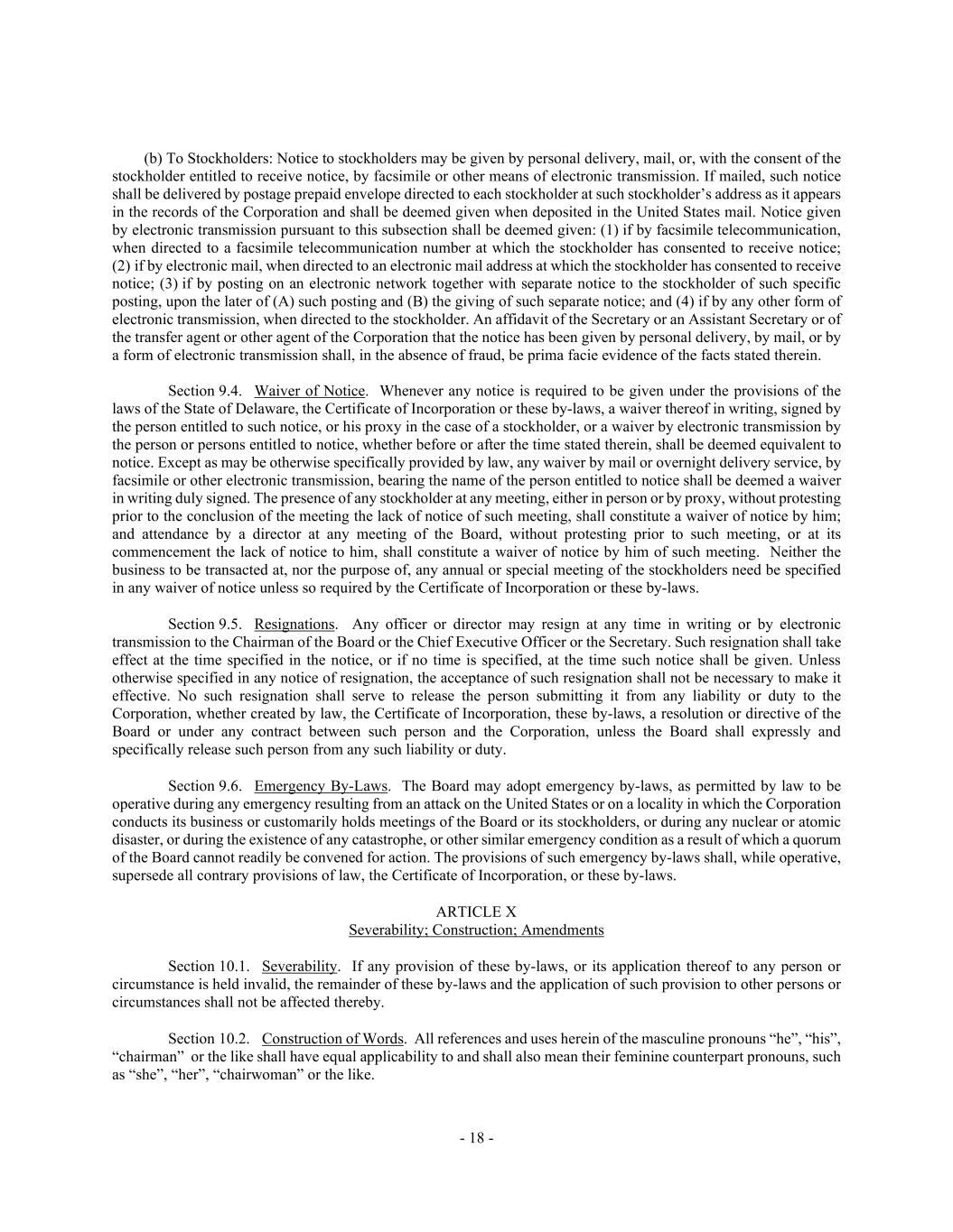 - 18 - (b) To Stockholders: Notice to stockholders may be given by personal delivery, mail, or, with the consent of the stockholder entitled to receive notice, by facsimile or other means of electronic transmission. If mailed, such notice shall be delivered by postage prepaid envelope directed to each stockholder at such stockholder’s address as it appears in the records of the Corporation and shall be deemed given when deposited in the United States mail. Notice given by electronic transmission pursuant to this subsection shall be deemed given: (1) if by facsimile telecommunication, when directed to a facsimile telecommunication number at which the stockholder has consented to receive notice; (2) if by electronic mail, when directed to an electronic mail address at which the stockholder has consented to receive notice; (3) if by posting on an electronic network together with separate notice to the stockholder of such specific posting, upon the later of (A) such posting and (B) the giving of such separate notice; and (4) if by any other form of electronic transmission, when directed to the stockholder. An affidavit of the Secretary or an Assistant Secretary or of the transfer agent or other agent of the Corporation that the notice has been given by personal delivery, by mail, or by a form of electronic transmission shall, in the absence of fraud, be prima facie evidence of the facts stated therein. Section 9.4. Waiver of Notice. Whenever any notice is required to be given under the provisions of the laws of the State of Delaware, the Certificate of Incorporation or these by-laws, a waiver thereof in writing, signed by the person entitled to such notice, or his proxy in the case of a stockholder, or a waiver by electronic transmission by the person or persons entitled to notice, whether before or after the time stated therein, shall be deemed equivalent to notice. Except as may be otherwise specifically provided by law, any waiver by mail or overnight delivery service, by facsimile or other electronic transmission, bearing the name of the person entitled to notice shall be deemed a waiver in writing duly signed. The presence of any stockholder at any meeting, either in person or by proxy, without protesting prior to the conclusion of the meeting the lack of notice of such meeting, shall constitute a waiver of notice by him; and attendance by a director at any meeting of the Board, without protesting prior to such meeting, or at its commencement the lack of notice to him, shall constitute a waiver of notice by him of such meeting. Neither the business to be transacted at, nor the purpose of, any annual or special meeting of the stockholders need be specified in any waiver of notice unless so required by the Certificate of Incorporation or these by-laws. Section 9.5. Resignations. Any officer or director may resign at any time in writing or by electronic transmission to the Chairman of the Board or the Chief Executive Officer or the Secretary. Such resignation shall take effect at the time specified in the notice, or if no time is specified, at the time such notice shall be given. Unless otherwise specified in any notice of resignation, the acceptance of such resignation shall not be necessary to make it effective. No such resignation shall serve to release the person submitting it from any liability or duty to the Corporation, whether created by law, the Certificate of Incorporation, these by-laws, a resolution or directive of the Board or under any contract between such person and the Corporation, unless the Board shall expressly and specifically release such person from any such liability or duty. Section 9.6. Emergency By-Laws. The Board may adopt emergency by-laws, as permitted by law to be operative during any emergency resulting from an attack on the United States or on a locality in which the Corporation conducts its business or customarily holds meetings of the Board or its stockholders, or during any nuclear or atomic disaster, or during the existence of any catastrophe, or other similar emergency condition as a result of which a quorum of the Board cannot readily be convened for action. The provisions of such emergency by-laws shall, while operative, supersede all contrary provisions of law, the Certificate of Incorporation, or these by-laws. ARTICLE X Severability; Construction; Amendments Section 10.1. Severability. If any provision of these by-laws, or its application thereof to any person or circumstance is held invalid, the remainder of these by-laws and the application of such provision to other persons or circumstances shall not be affected thereby. Section 10.2. Construction of Words. All references and uses herein of the masculine pronouns “he”, “his”, “chairman” or the like shall have equal applicability to and shall also mean their feminine counterpart pronouns, such as “she”, “her”, “chairwoman” or the like.