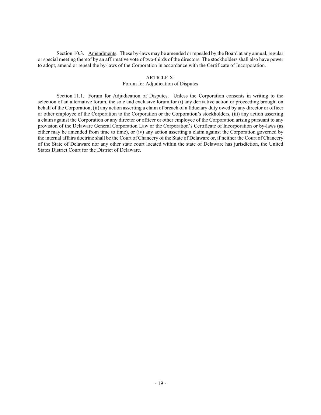 - 19 - Section 10.3. Amendments. These by-laws may be amended or repealed by the Board at any annual, regular or special meeting thereof by an affirmative vote of two-thirds of the directors. The stockholders shall also have power to adopt, amend or repeal the by-laws of the Corporation in accordance with the Certificate of Incorporation. ARTICLE XI Forum for Adjudication of Disputes Section 11.1. Forum for Adjudication of Disputes. Unless the Corporation consents in writing to the selection of an alternative forum, the sole and exclusive forum for (i) any derivative action or proceeding brought on behalf of the Corporation, (ii) any action asserting a claim of breach of a fiduciary duty owed by any director or officer or other employee of the Corporation to the Corporation or the Corporation’s stockholders, (iii) any action asserting a claim against the Corporation or any director or officer or other employee of the Corporation arising pursuant to any provision of the Delaware General Corporation Law or the Corporation’s Certificate of Incorporation or by-laws (as either may be amended from time to time), or (iv) any action asserting a claim against the Corporation governed by the internal affairs doctrine shall be the Court of Chancery of the State of Delaware or, if neither the Court of Chancery of the State of Delaware nor any other state court located within the state of Delaware has jurisdiction, the United States District Court for the District of Delaware.