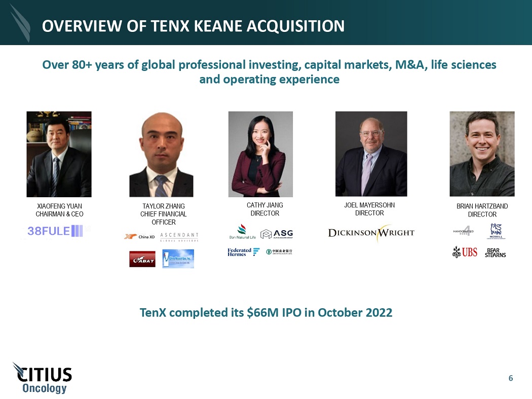 CRANFORD, N.J. and NEW YORK, N.Y., October 24, 2023 -- Citius Pharmaceuticals, Inc. (“Citius Pharma” or the “Company”) (Nasdaq: CTXR), a biopharmaceutical company developing and commercializing first-in-class critical care products, and TenX Keane Acquisition (“TenX”) (NASDAQ: TENKU), a publicly traded special purpose acquisition company (SPAC), today announced that they have entered into a definitive agreement, dated October 23, 2023, for a proposed merger of TenX and Citius Pharma’s wholly owned oncology subsidiary that will continue as a public company listed on the Nasdaq exchange. The newly combined public company will be named Citius Oncology, Inc. (“Citius Oncology”). Upon closing, pursuant to the terms of the merger agreement, Citius Pharma would receive 67.5 million shares in Citius Oncology at $10 per share and retain majority ownership of approximately 90%. The transaction has been approved by the Board of Directors of both companies and is expected to close in the first half of 2024.