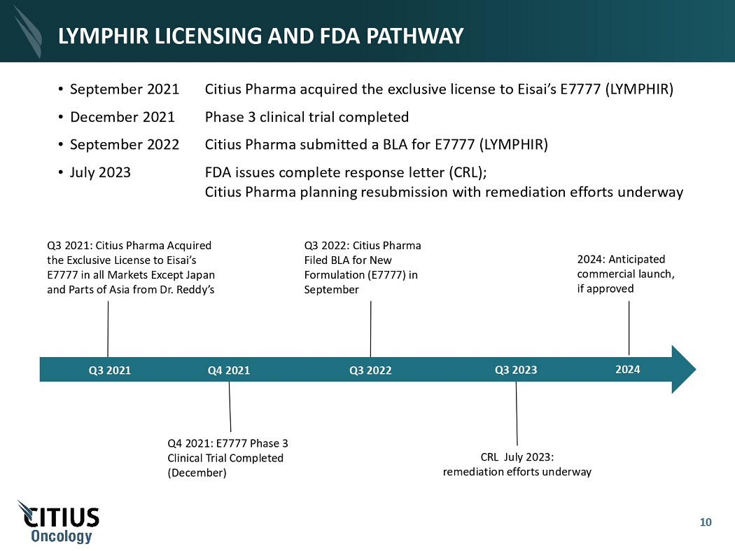 Citius Oncology’s lead product candidate is LYMPHIR, an engineered IL-2 diphtheria toxin fusion protein, for the treatment of patients with persistent or recurrent CTCL, a rare form of non-Hodgkin lymphoma. Management believes the market for LYMPHIR for CTCL, estimated to exceed $400 million, is attractive, growing and underserved by existing treatments. On July 28, 2023, the FDA issued a complete response letter (CRL) in response to the LYMPHIR BLA. The FDA is requiring enhanced product testing and additional controls agreed to with the FDA during the market application review. There were no concerns relating to the safety and efficacy of the clinical data package submitted with the BLA, or the proposed prescribing information. In September 2023, Citius Pharma announced that the FDA has agreed with the plans to address the requirements outlined in the CRL. This guidance has clarified the path forward in completing the necessary activities to support the resubmission of the BLA for LYMPHIR. The BLA resubmission is anticipated in early 2024.