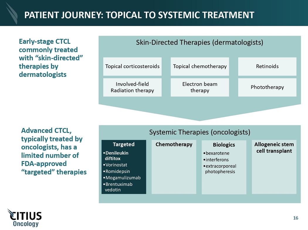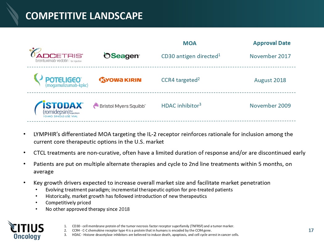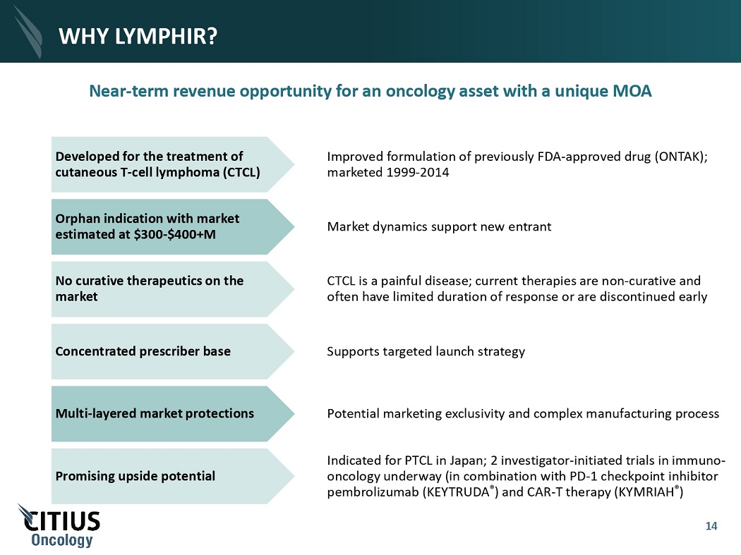 Citius Oncology will serve as a platform to develop and commercialize novel targeted oncology therapies. The company is seeking approval from the U.S. Food and Drug Administration (FDA) of LYMPHIR for an orphan indication in the treatment of persistent or recurrent cutaneous T-cell lymphoma (CTCL), a rare form of non-Hodgkin lymphoma. Management estimates the initial market for LYMPHIR currently exceeds $400 million, is growing and is underserved by existing therapies. If approved, LYMPHIR would be unique as the only IL-2 receptor targeted CTCL therapy, offering a novel option to patients cycling through multiple treatments. Robust intellectual property protections that span orphan drug designation, complex technology, trade secrets and pending patents for immuno-oncology use as a combination therapy with checkpoint inhibitors would further support Citius Oncology’s competitive positioning.
