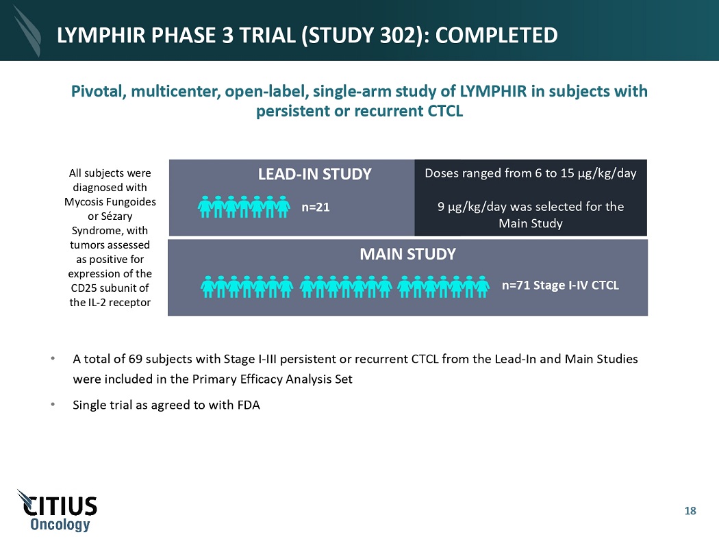 17 COMPETITIVE LANDSCAPE 1. CD30 - cell membrane protein of the tumor necrosis factor receptor superfamily (TNFRSF) and a tumor marker. 2. CCR4 - C - C chemokine receptor type 4 is a protein that in humans is encoded by the CCR4 gene. 3. HDAC - Histone deacetylase inhibitors are believed to induce death, apoptosis, and cell cycle arrest in cancer cells. • LYMPHIR’s differentiated MOA targeting the IL - 2 receptor reinforces rationale for inclusion among the current core therapeutic options in the U.S. market • CTCL treatments are non - curative, often have a limited duration of response and/or are discontinued early • Patients are put on multiple alternate therapies and cycle to 2nd line treatments within 5 months, on average • Key growth drivers expected to increase overall market size and facilitate market penetration • Evolving treatment paradigm; incremental therapeutic option for pre - treated patients • Historically, market growth has followed introduction of new therapeutics • Competitively priced • No other approved therapy since 2018 HDAC inhibitor 3 CCR4 targeted 2 CD30 antigen directed 1 N o v e mb e r 2009 August 2018 N o v e mb e r 2017 M OA App r o v al D a t e