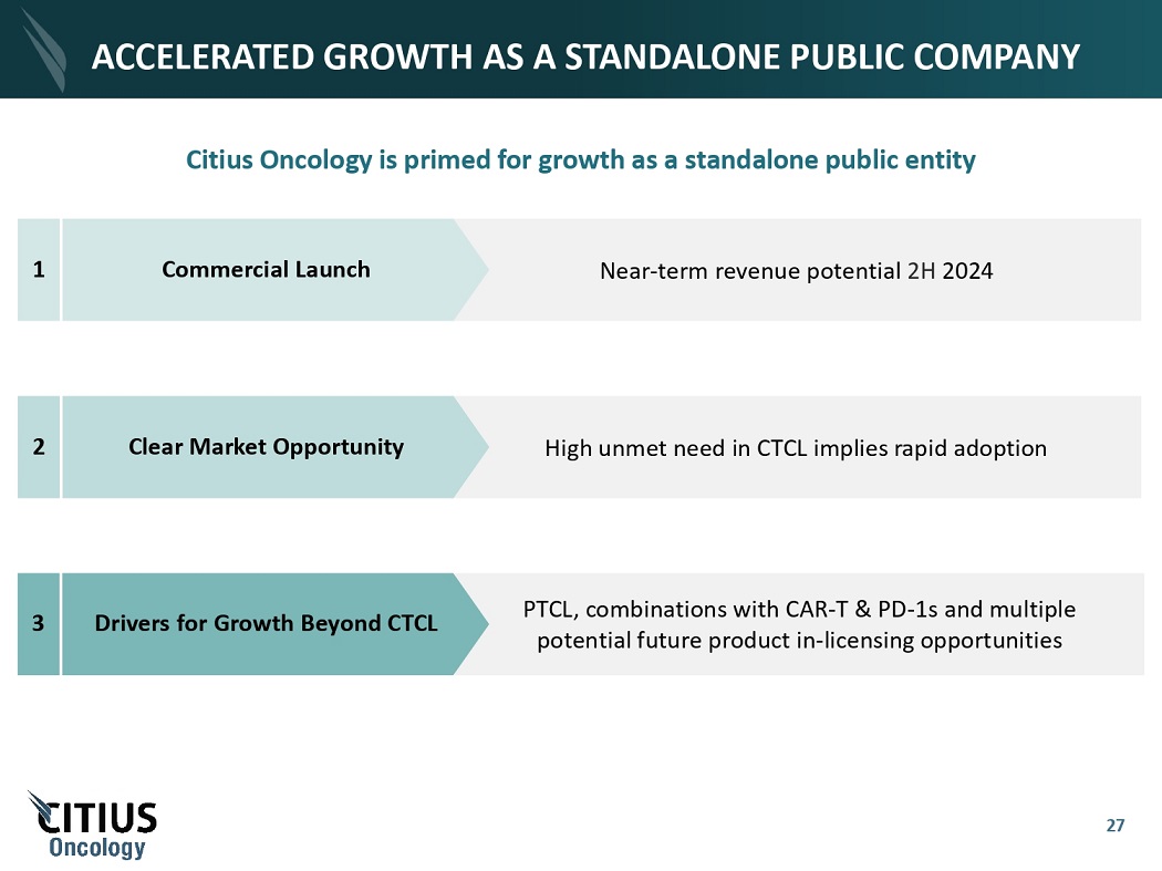 26 MERGER CONSIDERATION AND PRO FORMA OWNERSHIP • Citius Pharma to receive $675 million in equity of Citius Oncology, or 67.5 million shares at an implied value of $10 per share • An additional 12.75 million in equity options will be assumed by Citius Oncology • At closing, $10 million in cash provided by Citius Pharma and any cash remaining in TenX’s trust account would be contributed to Citius Oncology to support operations and planned commercialization efforts • Pro forma ownership of Citius Oncology 1 : • ~90% Citius Pharma • ~10% TenX public shareholders and founders 1. TenX and Citius Pharma negotiated and set the Base Exchange Ratio based on their assumptions about the value of Citius Oncology following the merger. Assumes de minimis redemptions by TenX public holders and $10m from Citius Pharma’s balance sheet.